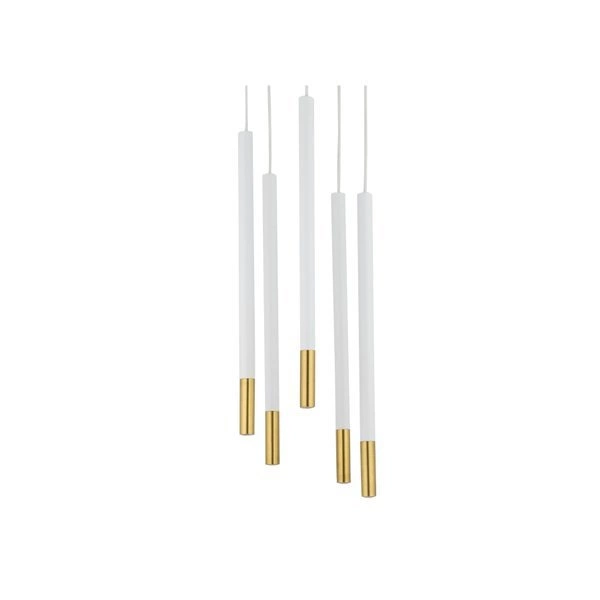Nowoczesna lampa wisząca SOPEL DUE 5 to wisząca lampa z 5 źródłami światła. Wykonana jest ze stali lakierowanej w kolorze białym oraz zakończeniami mosiężnymi w kolorze złotym. Wiszące białe sople wykończone zostały złotymi elementami nadającymi elegancji. Połączenie to sprawia, że wnętrze nabiera subtelności. Lampa nada charakteru wnętrzom minimalistycznym jak i klasycznym w jadalni, salonie, sypialni, biurze. Regulowana wysokość każdego sopla pozwala dostosować lampę według indywidualnych potrzeb. Maksymalna wysokość lampy 100 cm, szerokość klosza 25 cm. Wysokość sopla 50 cm, a średnica 2,5 cm.