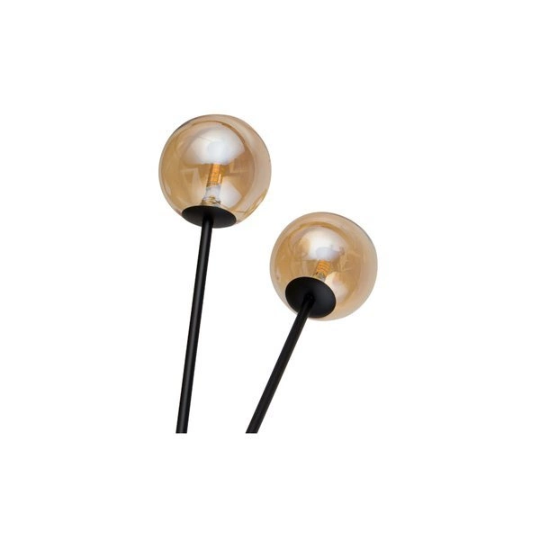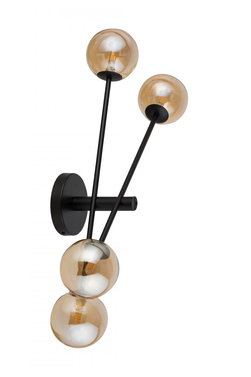 ORO KINKIET POCZWÓRNY to nowoczesna lampa z czterema  źródłami światła, która może być umieszczona na ścianie jak i na suficie. Stelaż lampy wykonany jest ze stali lakierowanej proszkowo w kolorze czarnym. Lampa posiada cztery szklane klosze w kształcie kul koloru bursztynowego na ramionach z pręta przytwierdzonego do podstawy kinkietu. Niebanalny wygląd lampy sprawia że będzie ona ozdobą każdego nowoczesnego: salonu, gabinetu, jadalni, sypialni, pokoju młodzieżowego, korytarza. Może stanowić uzupełnienie do lamp wiszących tej serii jak i być oddzielnym elementem wystroju wnętrza. Wysokość lampy to 26 cm, szerokość 78 cm, głębokość 17 cm. Wysokość klosza to 14 cm. Źródłem światła jest żarówka typu G9 o mocy max. 25W w ilości 4 szt.
