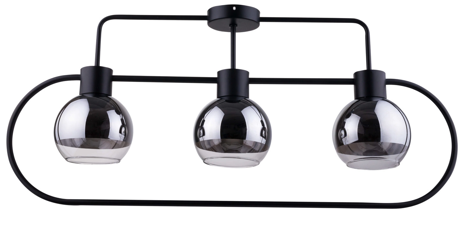 LINDA 3 PL to nowoczesna lampa sufitowa z 3 źródłami światła. Stelaż lampy wykonany jest ze stali lakierowanej proszkowo w kolorze czarnym, posiada trzy szklane srebrne transparentne klosze. Lampa kształtem przypomina poziomą elipsę wewnątrz której znajdują się klosze. Jest idealnym wyborem do wnętrz industrialnych, typu loft, nowoczesnych oraz klasycznych. Idealnie wkomponuje się do salonu, gabinetu, biura, sypialni, jadalni, pokoju młodzieżowego. Wysokość lampy to 37 cm, szerokość 83 cm, głębokość 14 cm. Klosz ma wysokość 13 cm. Źródłem światła jest żarówka typu E27 o mocy max. 60W w ilości 3 szt.