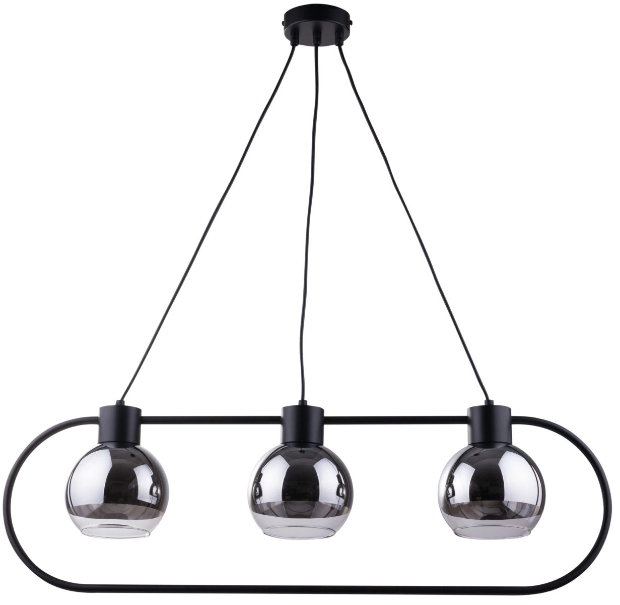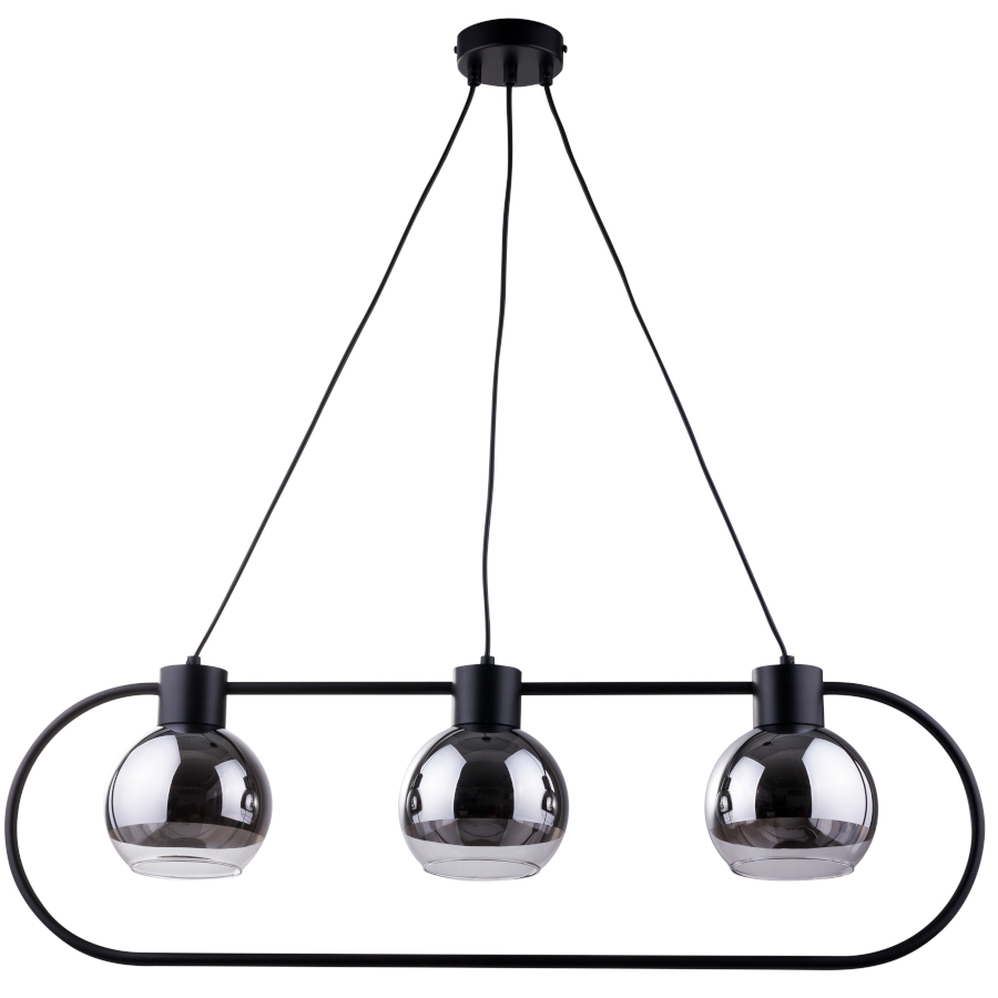 LINDA 3 PL to nowoczesna lampa sufitowa z 3 źródłami światła. Stelaż lampy wykonany jest ze stali lakierowanej proszkowo w kolorze czarnym, posiada trzy szklane srebrne transparentne klosze. Lampa kształtem przypomina poziomą elipsę wewnątrz której znajdują się klosze. Jest idealnym wyborem do wnętrz industrialnych, typu loft, nowoczesnych oraz klasycznych. Idealnie wkomponuje się do salonu, gabinetu, biura, sypialni, jadalni, pokoju młodzieżowego. Regulowana wysokość pozwala dostosować lampę do wnętrza. Wysokość maksymalna lampy to 80 cm, szerokość 83 cm, głębokość 14 cm. Klosz ma wysokość 13 cm. Źródłem światła jest żarówka typu E27 o mocy max. 60W w ilości 3 szt.
