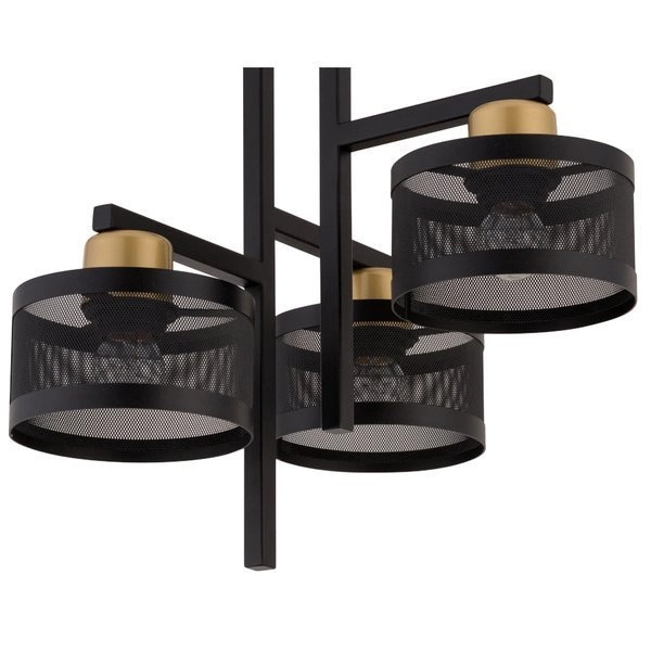 OFF 3 PLAFON to nowoczesna lampa sufitowa z 3 źródłami światła. Stelaż lampy wykonany jest ze stali lakierowanej na kolor czarny. Plafon posiada trzy klosze w kształcie walca wykonane z metalowej siatki koloru czarnego. Oprawa żarówki ma kolor złoty. Klosze zostały asymetrycznie ułożone na poziomych ramionach. Lampa jest idealnym wyborem do wnętrz nowoczesnych, industrialnych oraz typu loft. Doskonale wkomponuje się do: pokoju młodzieżowego, gabinetu, biura, lokalu, jadalni, kuchni, salonu, sypialni. Wysokość lampy to 41 cm, szerokość 42 cm, głębokość 35 cm. Klosz ma wysokość 8,5 cm i średnicę 15 cm. Źródłem światła jest żarówka typy E27 o mocy max. 60W w ilości 3 szt.
