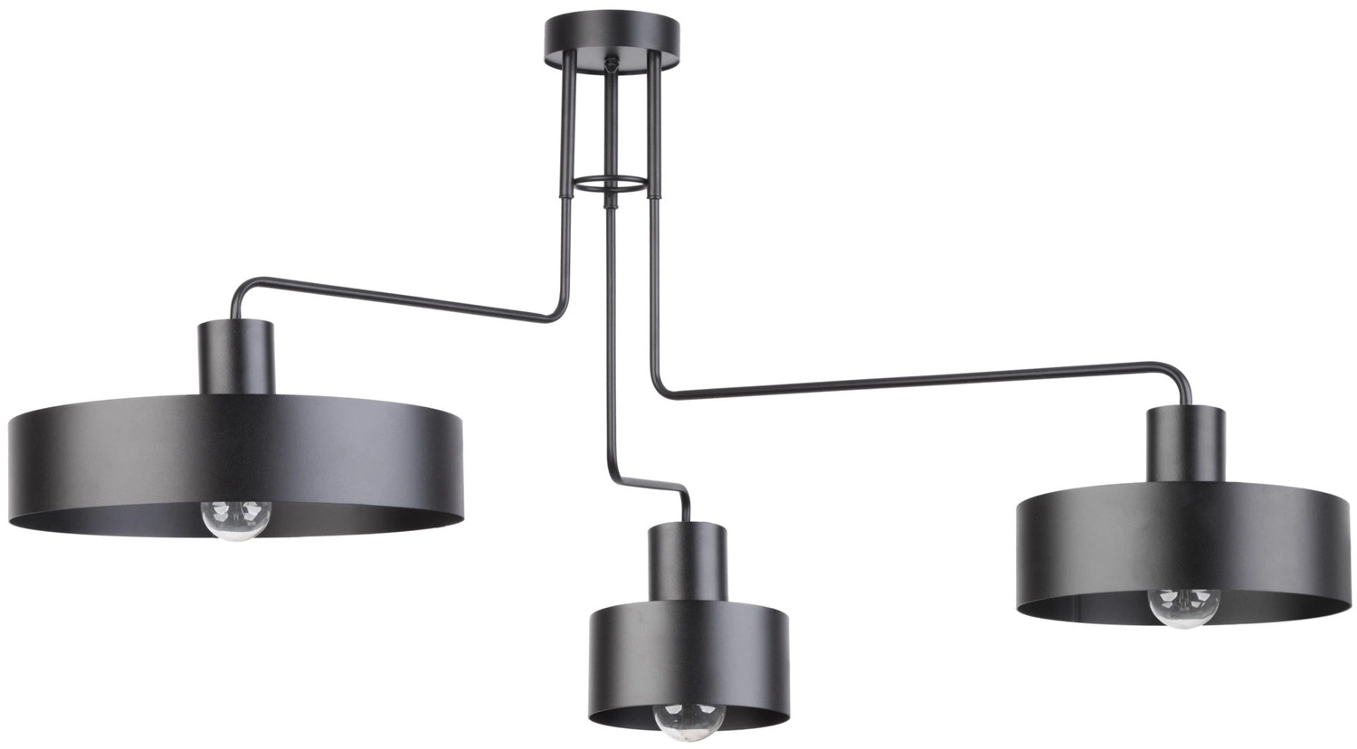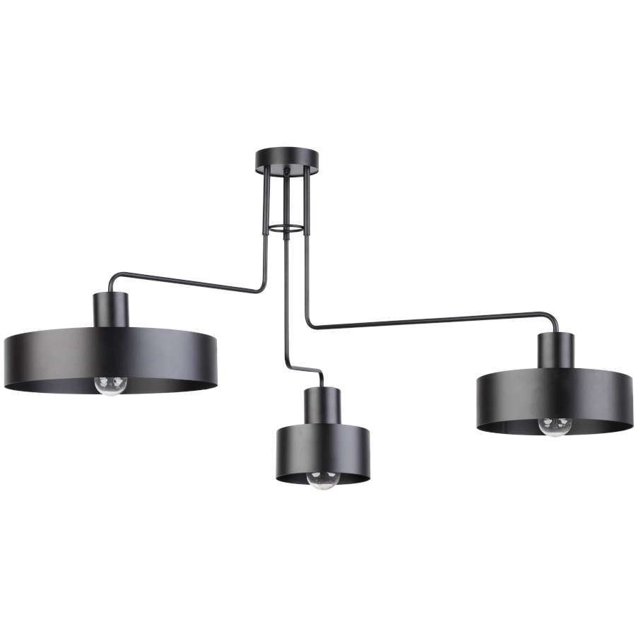VASCO 3 to nowoczesna lampa sufitowa z 3 źródłami światła. Stelaż lampy wykonano z stali lakierowanej na kolor czarny. Lampa posiada trzy stalowe czarne klosze w różnych rozmiarach osadzone na ruchomych ramionach. Ruchome ramiona sprawiają, że lampa jest niezwykle praktyczna. Czerń jest uniwersalna a zarazem różnorodna, więc można ją wprowadzić do niemalże każdej aranżacji. Lampa jest idealnym wyborem do wnętrz nowoczesnych, klasycznych oraz typu loft. Doskonale wkomponuje się do: pokoju młodzieżowego, gabinetu, biura, lokalu, jadalni, kuchni, salonu, sypialni. Wysokość lampy to 62 cm, szerokość maksymalna 93 cm, głębokość 35 cm. Klosze mają taką samą wysokość 8 cm i różne średnice: 35 cm, 25 cm, 15 cm. Źródłem światła jest żarówka typu E27 o mocy max. 60W w ilości 3 szt.