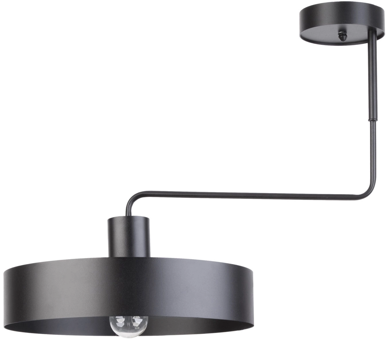 VASCO 1 to nowoczesna lampa sufitowa z jednym źródłem światła. Stelaż lampy wykonano z stali lakierowanej na kolor czarny. Lampa posiada stalowy czarny klosz osadzony na ruchomym ramieniu. Ruchome ramię sprawia, że lampa jest niezwykle praktyczna. Czerń jest uniwersalna a zarazem różnorodna, więc można ją wprowadzić do niemalże każdej aranżacji. Lampa jest idealnym wyborem do wnętrz nowoczesnych, klasycznych oraz typu loft. Doskonale wkomponuje się do: pokoju młodzieżowego, gabinetu, biura, lokalu, jadalni, kuchni, salonu, sypialni. Wysokość lampy to 49 cm, szerokość maksymalna 64 cm, głębokość 35 cm. Klosz ma wysokość 8 cm i średnicę 35 cm. Źródłem światła jest żarówka typu E27 o mocy max. 60W w ilości 1 szt.