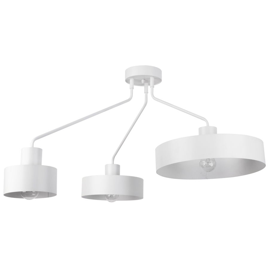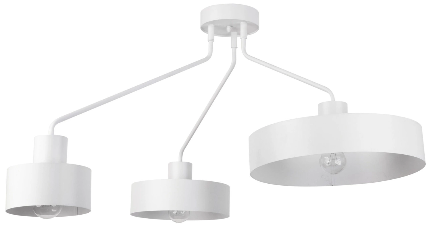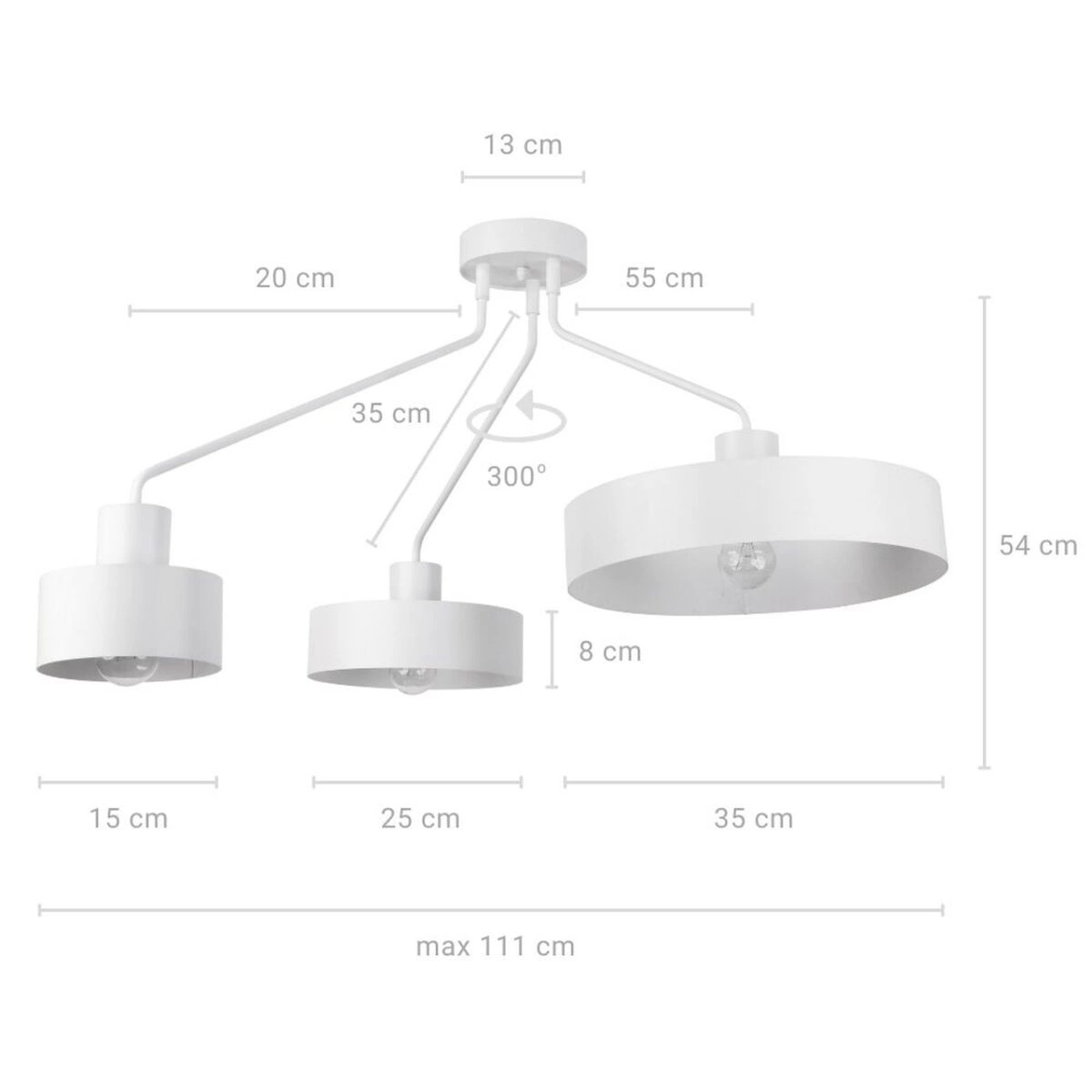 JUMBO 3 to nowoczesna lampa sufitowa z 3 źródłami światła. Stelaż lampy wykonano z stali lakierowanej na kolor biały. Lampa posiada trzy stalowe białe klosze w różnych rozmiarach osadzone na ruchomych ramionach. Ruchome ramiona sprawiają, że lampa jest niezwykle praktyczna. Biel świetnie sprawdza się w każdym wnętrzu, aranżacje uzupełnione białym oświetleniem stają się bardziej eleganckie i subtelne. Lampa jest idealnym wyborem do wnętrz nowoczesnych, klasycznych oraz typu loft. Doskonale wkomponuje się do: pokoju młodzieżowego, gabinetu, biura, lokalu, jadalni, kuchni, salonu, sypialni. Wysokość lampy to 53 cm, szerokość maksymalna 111 cm, głębokość 35 cm. Klosze mają taką samą wysokość 8 cm i różne średnice: 35 cm, 25 cm, 15 cm. Źródłem światła jest żarówka typu E27 o mocy max. 60W w ilości 3 szt.