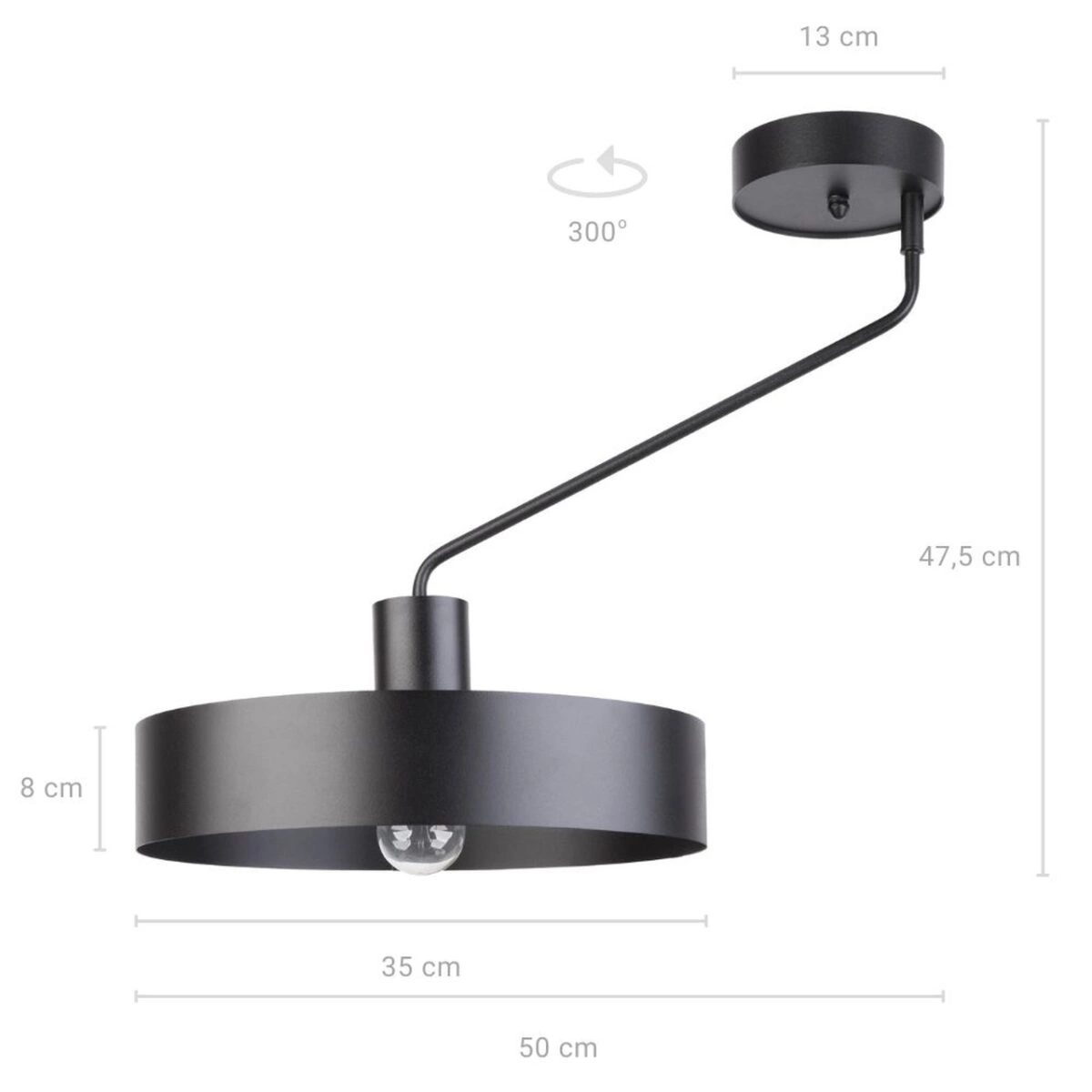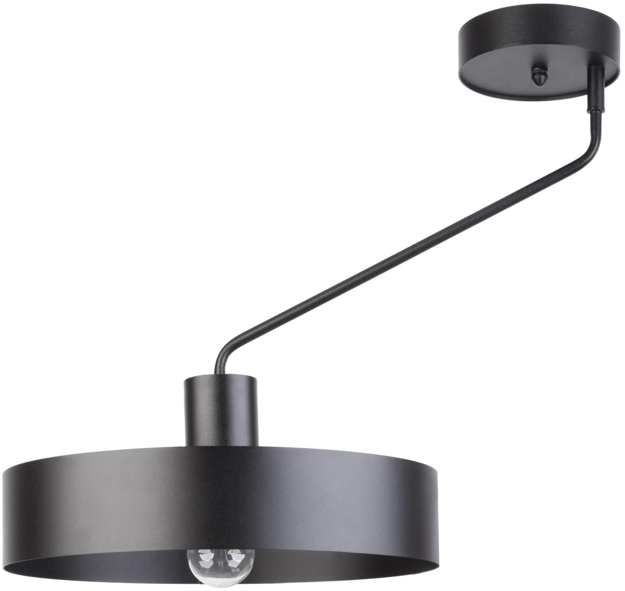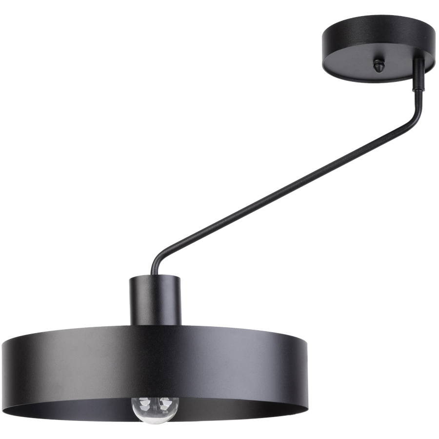 JUMBO 1 to nowoczesna lampa sufitowa z jednym źródłem światła. Stelaż lampy wykonano z stali lakierowanej na kolor czarny. Lampa posiada stalowy czarny klosz osadzony na ruchomym ramieniu. Ruchome ramię sprawia, że lampa jest niezwykle praktyczna. Czerń jest uniwersalna a zarazem różnorodna, więc można ją wprowadzić do niemalże każdej aranżacji. Lampa jest idealnym wyborem do wnętrz nowoczesnych, klasycznych oraz typu loft. Doskonale wkomponuje się do: pokoju młodzieżowego, gabinetu, biura, lokalu, jadalni, kuchni, salonu, sypialni. Wysokość lampy to 47,5 cm, szerokość 50 cm, głębokość 35 cm. Klosz ma wysokość 8 cm i średnicę 35 cm. Źródłem światła jest żarówka typu E27 o mocy max. 60W w ilości 1 szt.