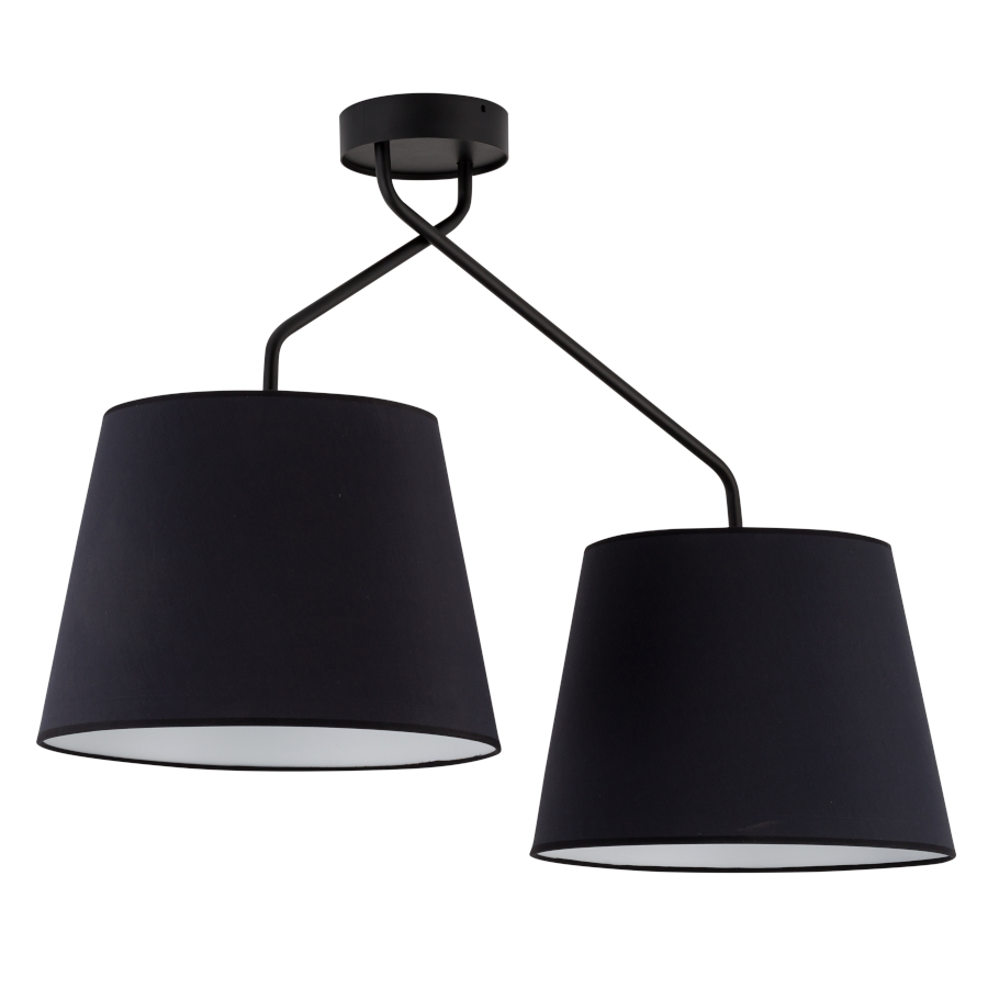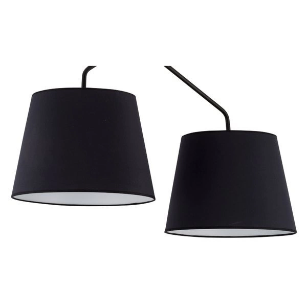 LIZBONA 2 PLAFON to stylowa lampa sufitowa z dwoma źródłami światła. Stelaż lampy wykonano ze stali lakierowanej w kolorze czarnym. Lampa posiada dwa asymetrycznie ułożone klosze na krótkich wygiętych ramionach. Klosze zostały wykonane z materiału na folii PCV, koloru czarnego na zewnątrz i białego od wewnątrz. Plafon będzie idealnym uzupełnieniem klasycznych oraz nowoczesnych wnętrz. Doskonale wkomponuje się do: pokoju młodzieżowego, gabinetu, biura, lokalu, jadalni, kuchni, salonu, sypialni. Wysokość lampy to 55 cm, szerokość 82 cm, głębokość 35 cm. Klosz ma wysokość 26 cm i średnicę 35 cm. Źródłem światła jest żarówka typu E27 o mocy max 60W w ilości 2 szt.