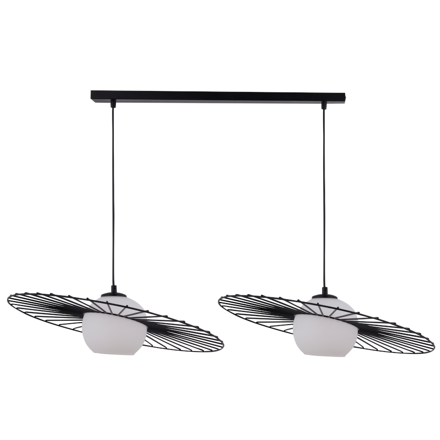 SOL 2 to nowoczesna lampa wisząca z dwoma źródłami światła. Korpus lampy wykonano ze stali lakierowanej na kolor czarny. Lampa posiada dwa szklane białe klosze w kształcie kuli, na które nałożono ruchomą ozdobną ażurową instalację z drutu w kolorze czarnym. Lampa jest idealnym wyborem do nowoczesnych wnętrz. Doskonale wkomponuje się do: salonu, gabinetu, jadalni, kuchni, sypialni, pokoju młodzieżowego. Lampa posiada możliwość regulacji wysokości. Wysokość maksymalna lampy to: 70 cm, szerokość maksymalna 100 cm, głębokość 50 cm. Klosz ma wysokość 13 cm. Źródłem światła jest żarówka tylu E27 o mocy max 60W w ilości 2 szt.