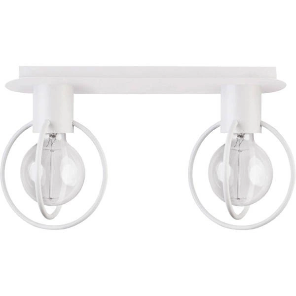 AURA KOŁO 2 PLAFON to nowoczesna lampa sufitowa z dwoma źródłami światła. Korpus lampy wykonano ze stali lakierowanej na kolor biały. Lampa posiada dwa białe klosze, każdy z nich ma dwa prostopadle ułożone pierścienie z drutu wokół żarówki. Dodatkowym elementem ozdobnym jest w tej lampie żarówka, dlatego warto zdecydować się na jej dekoracyjne modele. Biel świetnie się sprawdza w każdym wnętrzu, zastosowanie oświetlenia w tym kolorze dodaje elegancji i subtelności. Lampa jest idealnym wyborem do nowoczesnych oraz loftowych wnętrz. Doskonale wpasuje się do: pokoju młodzieżowego, gabinetu, biura, lokalu, jadalni, salonu, sypialni. Wysokość lampy to 28 cm, szerokość 42 cm, głębokość 15 cm. Klosz ma wysokość 21 cm. Źródłem światła jest żarówka typu E27 o mocy max 60W w ilości 2 szt.
