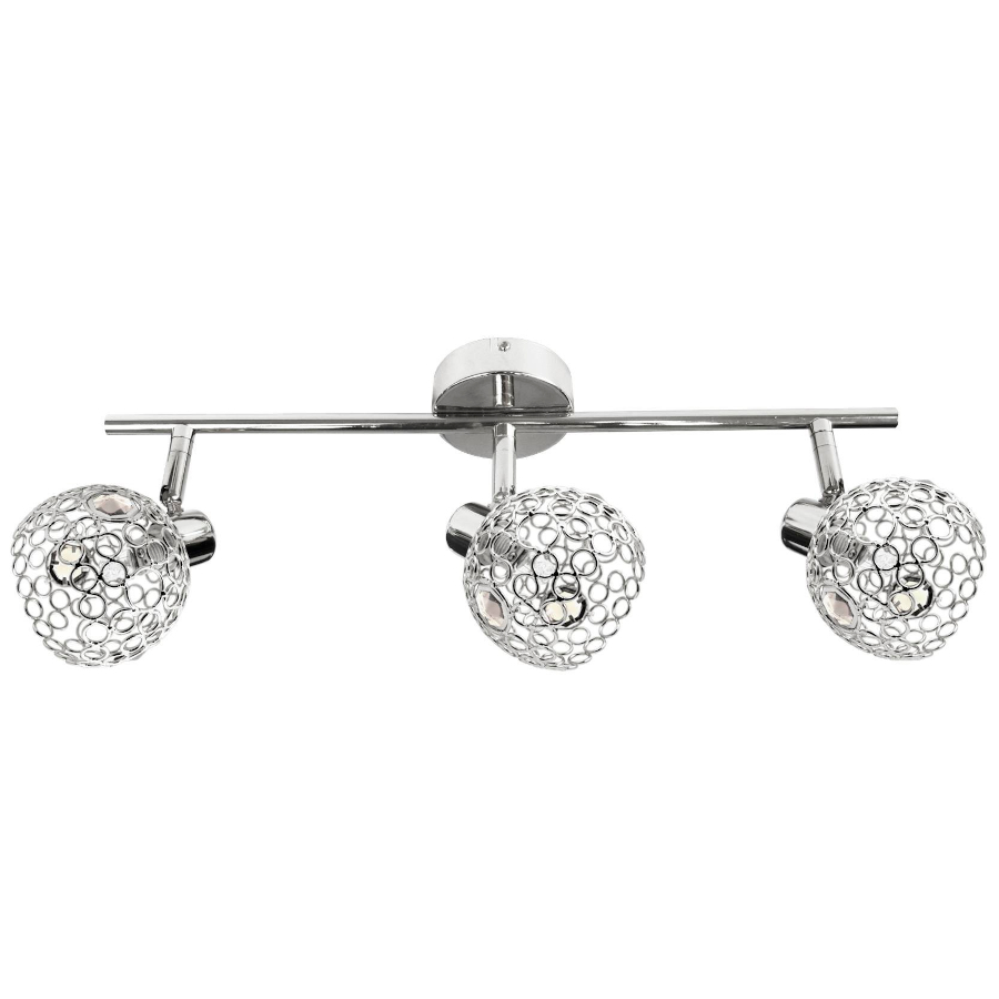 ARON 93-12333 to nowoczesna lampa sufitowa z trzema źródłami światła. Korpus lampy wykonano z chromowanego metalu. Lampa posiada trzy niezwykle eleganckie kuliste klosze zdobione transparentnymi kryształkami. Klosze są osadzone na ruchomych przegubach, które dają możliwość regulacji w pionie i poziomie. Oprawa będzie idealnym wyborem do wnętrz urządzonych w nowoczesnym stylu. Doskonale będzie się prezentować w: salonie, jadalni, sypialni, pokoju młodzieżowym, gabinecie, biurze, lokalu, przedpokoju, korytarzu. Lampa ma wysokość 17 cm i szerokość 55 cm. Źródłem światła jest żarówka typu G9 o mocy max 40W w ilości 3 szt.