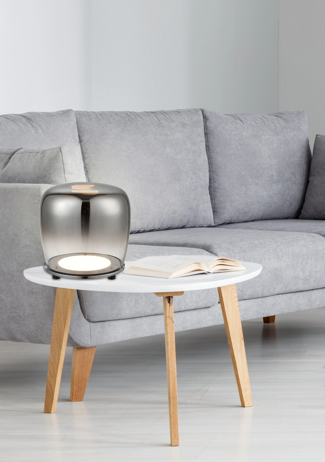 Seria dwóch nowoczesnych lamp stojących wykonanych z przydymionego szkła ze zintegrowanym źródłem światła LED. Doskonale komponuje się w nowoczesne jak i klasyczne wnętrza. Idealnie nadaje się do salonu, gabinetu, sypialni, przedpokoju. Lampa o średnicy 18 cm z jednym, zintegrowanym punktem świetnym LED.