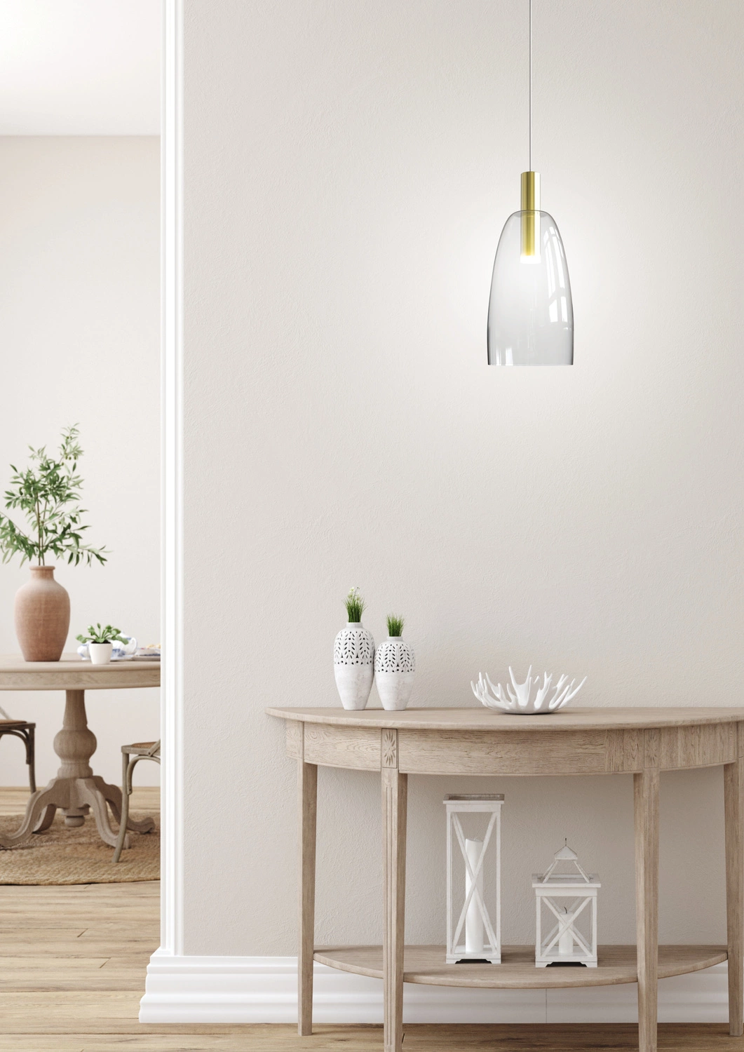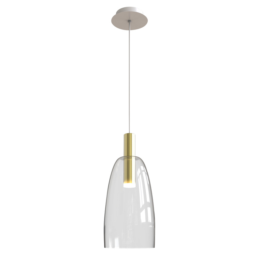 MODENA LEDEA 50133067 to stylowa lampa wisząca z jednym źródłem światła. Zawiesie lampy wykonano z wysokiej jakości metalu w kolorze biało-złotym, klosz jest transparentny. Oprawa będzie idealnym wyborem do wnętrz urządzonych w stylu skandynawskim oraz nowoczesnym. Doskonale będzie się prezentować w: salonie, jadalni, sypialni, pokoju młodzieżowym, gabinecie, lokalu, kuchni. Dużym atutem jest możliwość regulacji wysokości. Wysokość maksymalna lampy to: 140 cm, średnica 14,5 cm. Źródłem światła jest zintegrowany LED o mocy 5W, ciepłej barwie 3000K i jasności 260lm