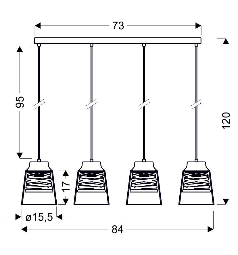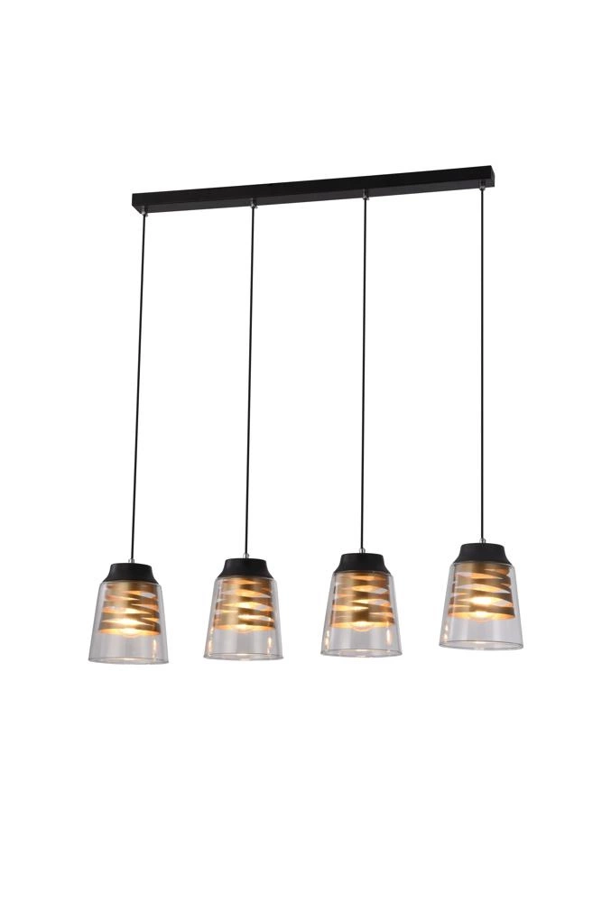 FRESNO 34-78124 to stylowa lampa wisząca z czterema źródłami światła. Zawiesie lampy wykonano z wysokiej jakości stali w kolorze czarnym, klosze są z transparentnego szkła z ozdobnymi złotymi spiralami z metalu wokół żarówek. Oprawa będzie idealnym wyborem do wnętrz urządzonych w stylu industrialnym oraz loftowym. Doskonale będzie się prezentować w salonie, jadalni, sypialni, pokoju, młodzieżowym, gabinecie, lokalu, kuchni. Dużą zaletą jest możliwość regulacji wysokości. Wysokość maksymalna lampy to: 120 cm, szerokość 84 cm, głębokość 15,5 cm. Źródłem światła jest żarówka typu E27 o mocy max 60W w ilości 4 szt.
