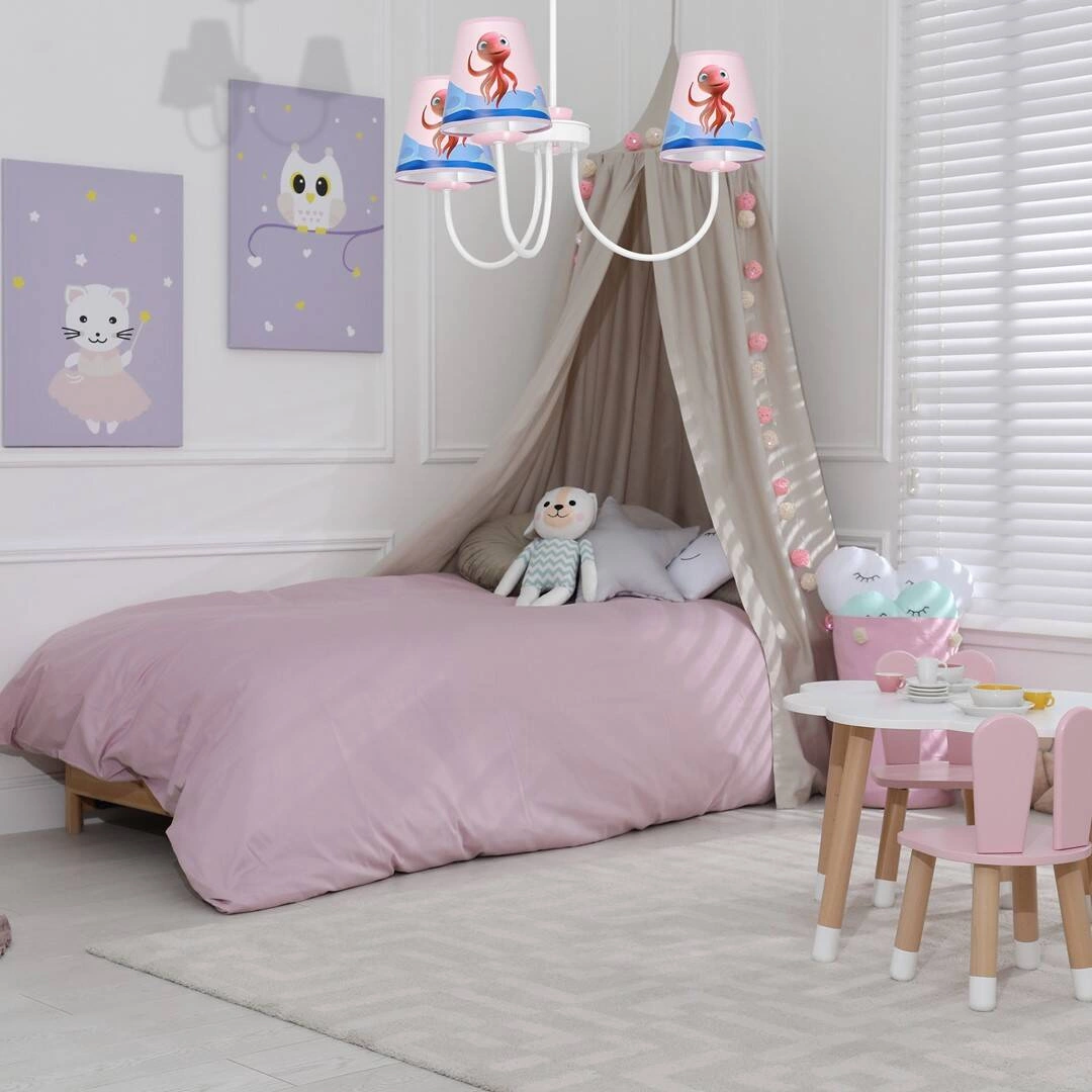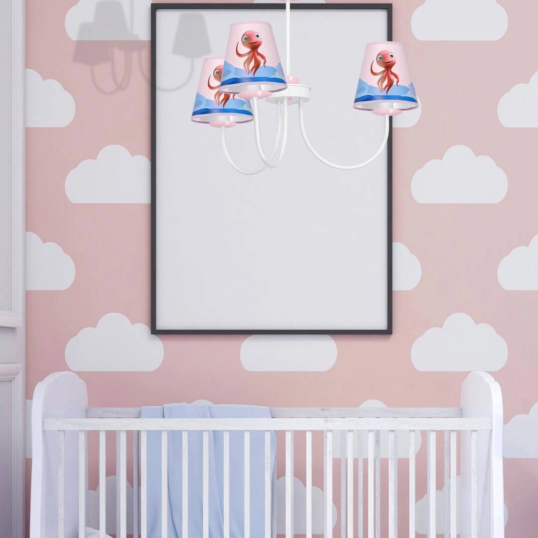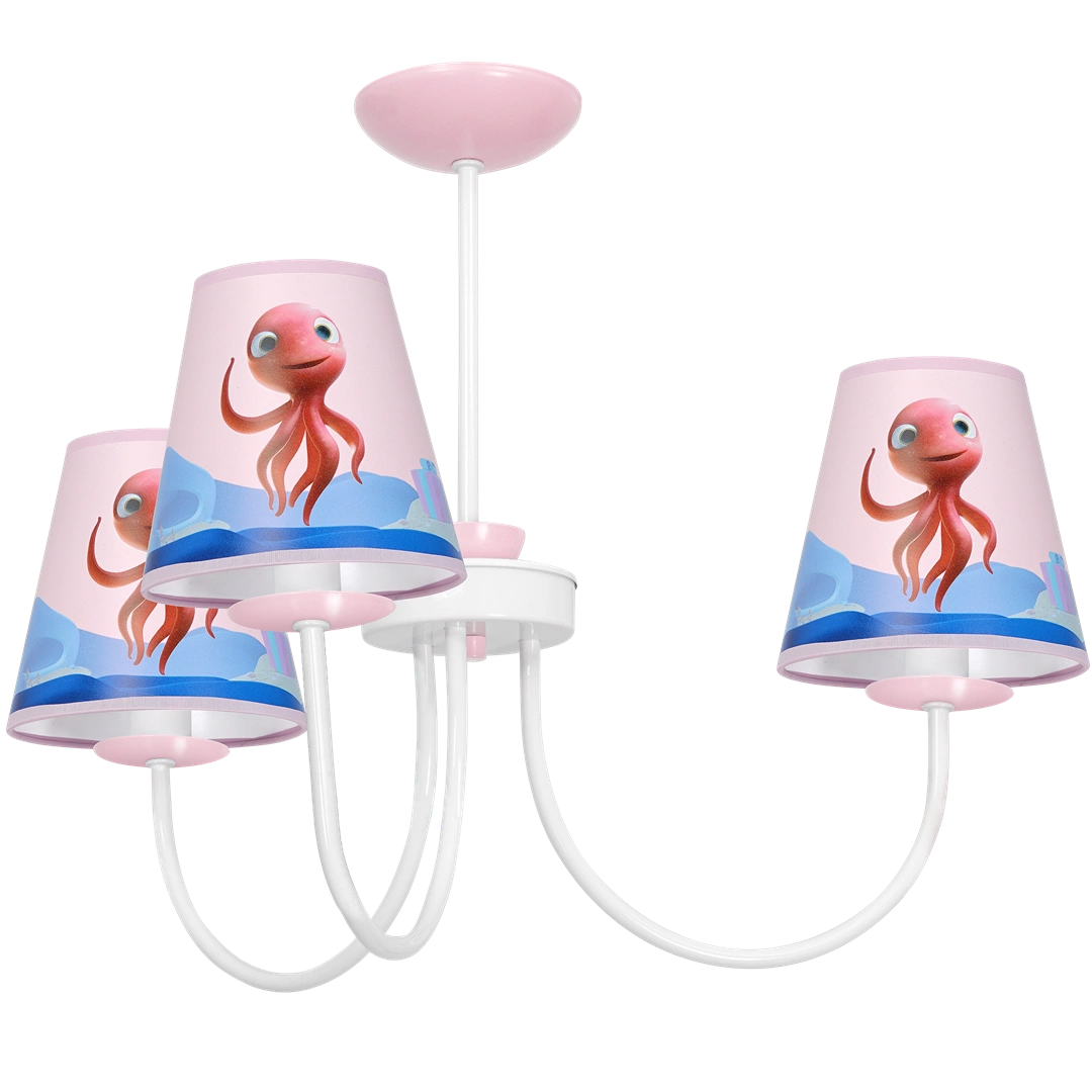 MINI MINI MLP6810 to nowoczesny żyrandol z trzema źródłami światła przeznaczony do dziecięcego pokoju. Korpus lampy wykonano z wysokiej jakości metalu w kolorze białym z różowymi detalami. Klosze są z tworzywa sztucznego z wielokolorowym motywem bajkowej postaci Ośmiorniczki Loli. Wysokość lampy to: 40 cm, średnica 62 cm. Źródłem światła jest żarówka typu E14 o mocy max 40W w ilości 3 szt.