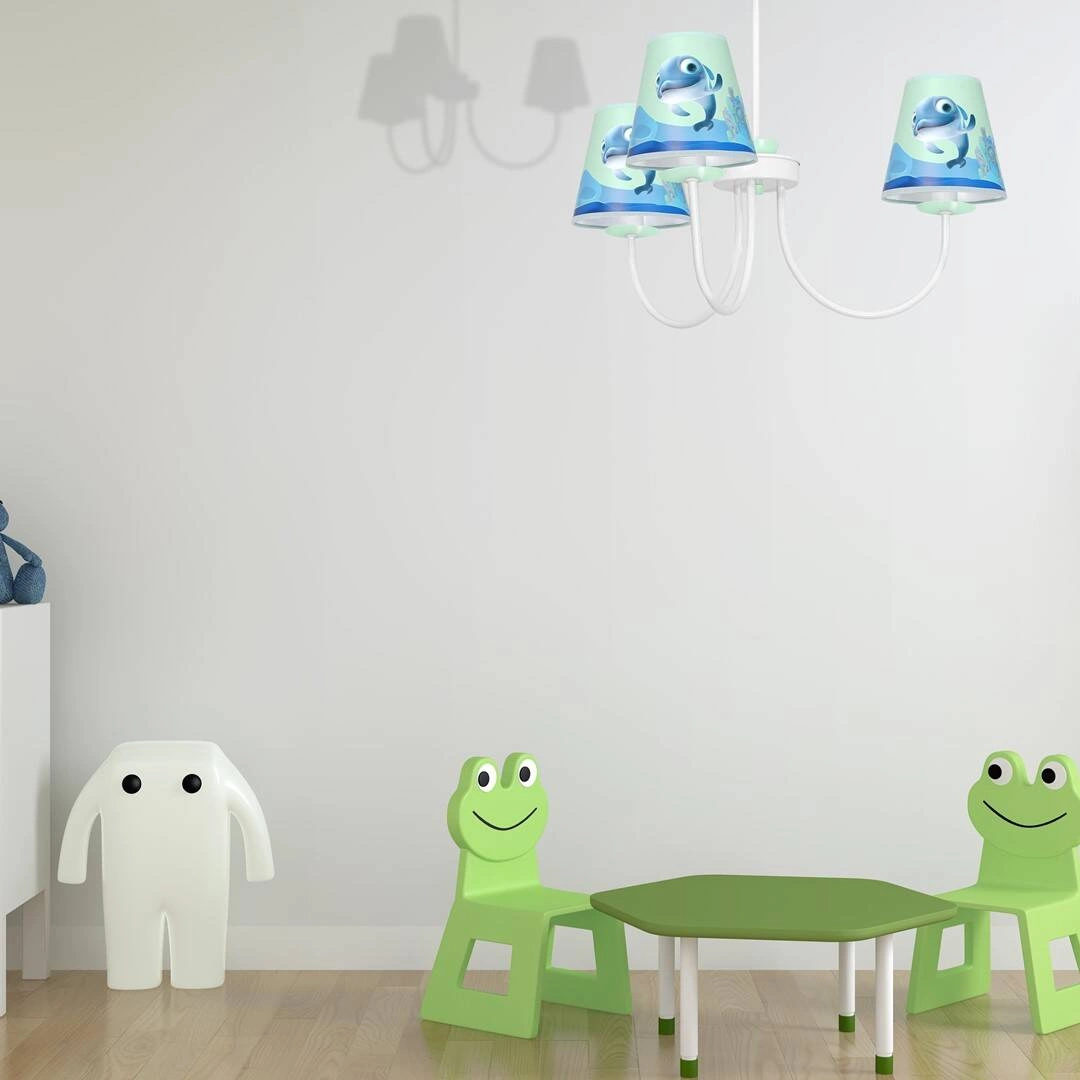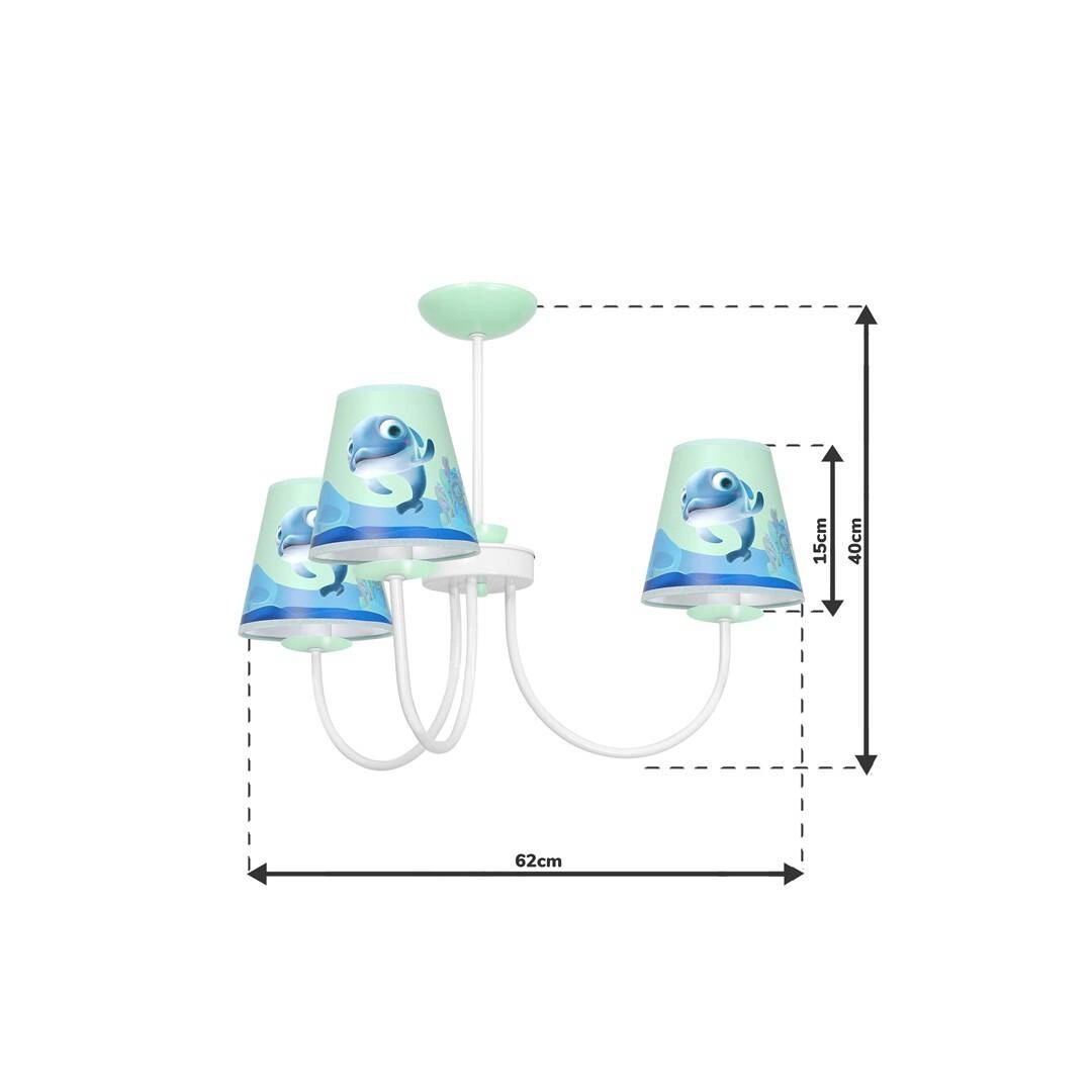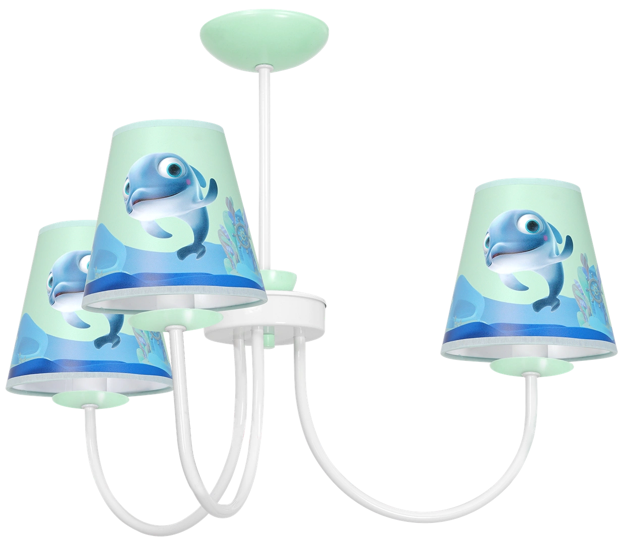 MINI MINI MLP6811 to nowoczesny żyrandol z trzema źródłami światła przeznaczony do dziecięcego pokoju. Korpus lampy wykonano z wysokiej jakości metalu w kolorze białym z miętowymi detalami. Klosze są z tworzywa sztucznego z wielokolorowym motywem bajkowej postaci Delfinka Finka. Wysokość lampy to: 40 cm, średnica 62 cm. Źródłem światła jest żarówka typu E14 o mocy max 40W w ilości 3 szt.