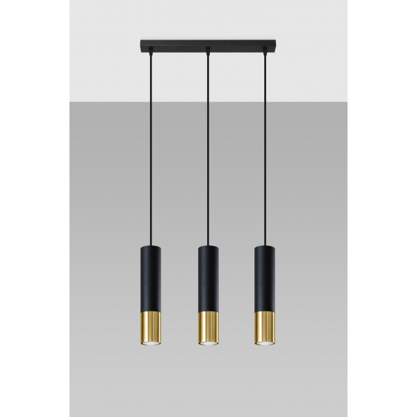 LOOPEZ 3L SL.0954 to nowoczesna lampa wisząca z trzema źródłami światła. Wykonana została z wysokiej jakości stali w kolorze czarno-złotym. Lampa posiada trzy klosze w kształcie tuby zwisające z podłużnej podsufitki. Oprawa będzie idealnym wyborem do wnętrz urządzonych w nowoczesnym stylu. Doskonale będzie się prezentować w: salonie, jadalni, sypialni, pokoju młodzieżowym, gabinecie, biurze, lokalu. Dużą zaletą jest możliwość regulacji wysokości. Wysokość maksymalna lampy to: 90 cm, szerokość 45 cm, głębokość 6 cm. Źródłem światła jest żarówka typu GU10 o mocy max 40W w ilości 3 szt.