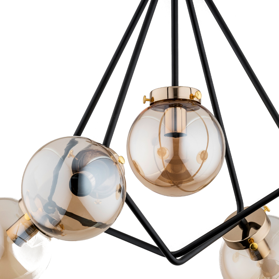 Minimalistycznej konstrukcja i ciekawy design lampy w połączeniu z transparentnymi kloszami w odcieniu złota,