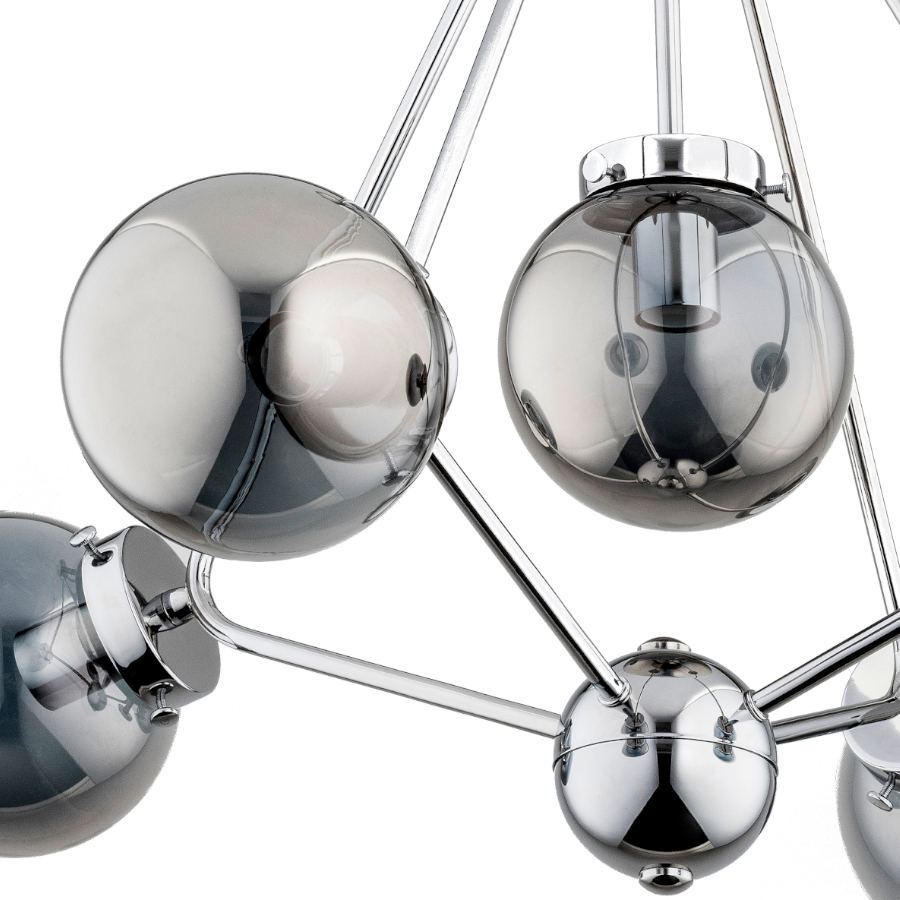 Niestandardowa konstrukcja i ciekawy design lampy w połączeniu z ozdobnymi kloszami,