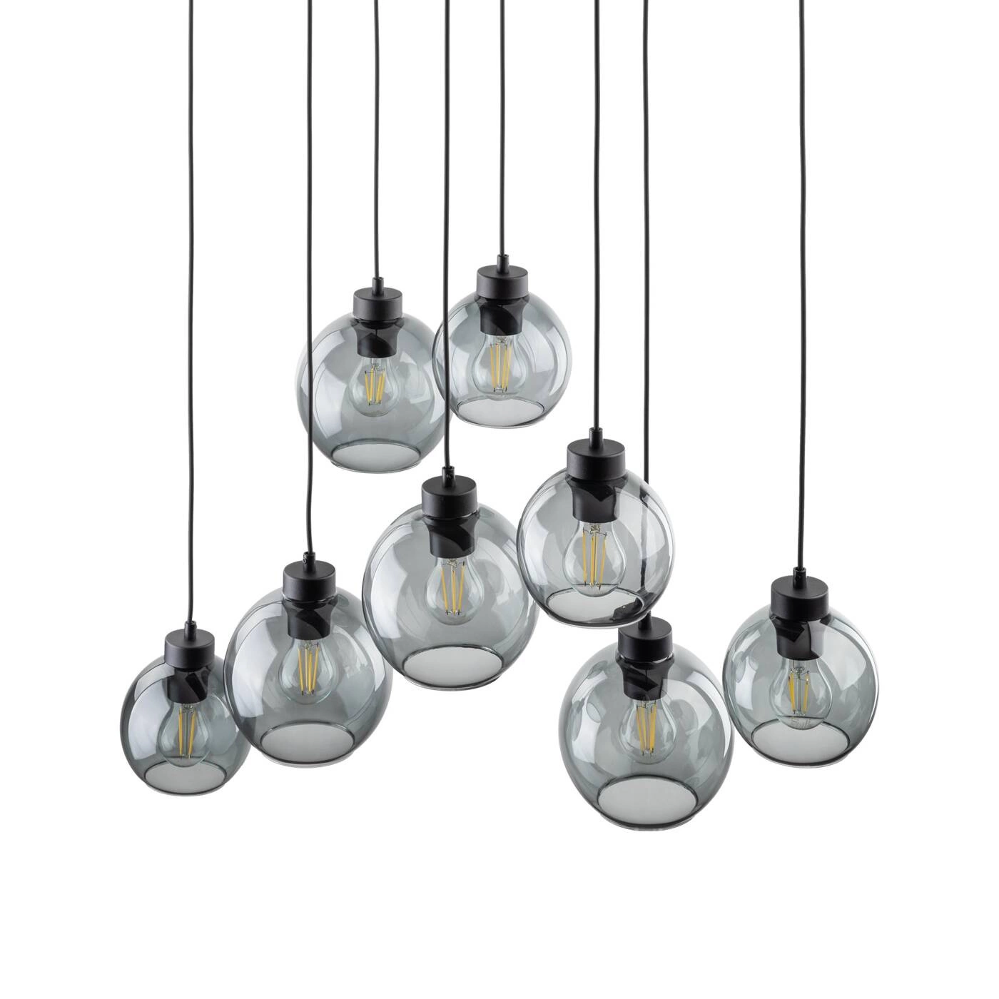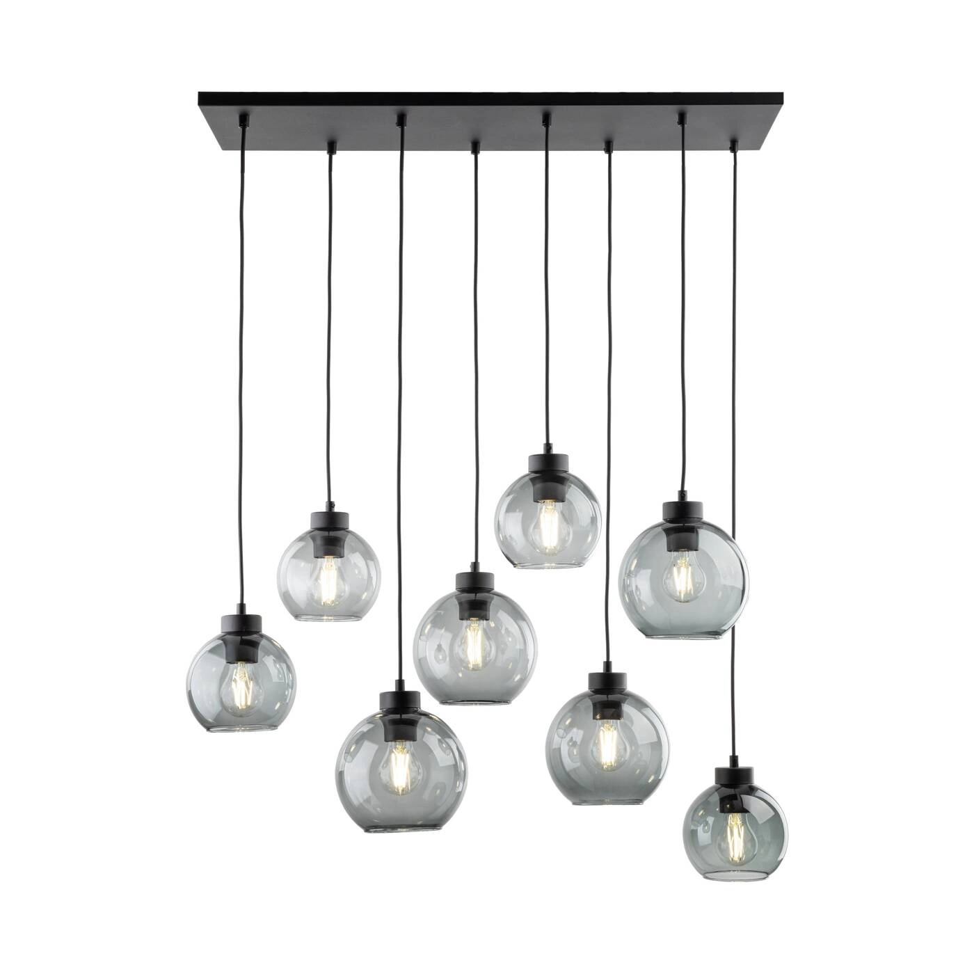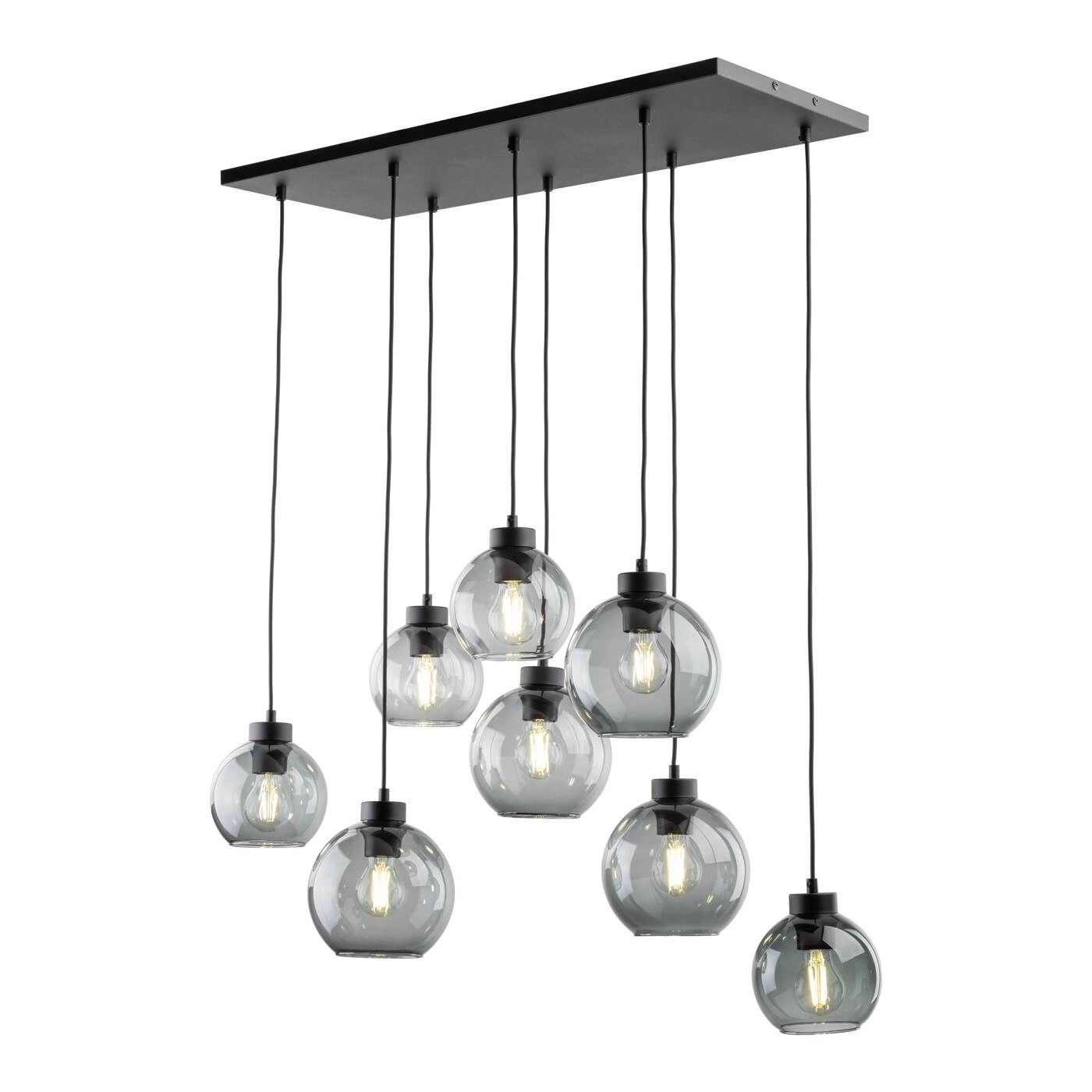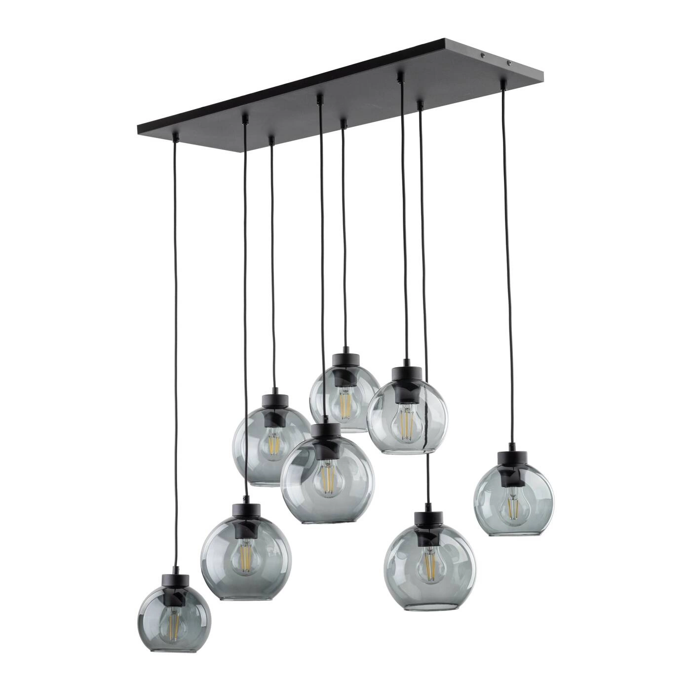 CUBUS GRAPHITE 4113 to nowoczesna lampa wisząca z ośmioma źródłami światła. Wykonana została z metalu w kolorze czarnym. Lampa posiada osiem szklanych kloszy w kształcie kul zwisających z prostokątnej podsufitki. Klosze są przeźroczyste i mają kolor grafitowy, dzięki czemu widoczne żarówki mogą być elementami ozdobnymi lampy dlatego warto wybrać ich dekoracyjny model. Lampa będzie idealnym wyborem do nowoczesnych wnętrz. Doskonale będzie się prezentować w: salonie, jadalni, sypialni, pokoju młodzieżowym, lokalu, gabinecie. Dużą zaletą jest możliwość regulacji wysokości. Wysokość maksymalna lampy to: 112 cm, szerokość 110 cm, głębokość 45 cm. Źródłem światła jest żarówka typu E27 o mocy max 60W w ilości 8 szt.
