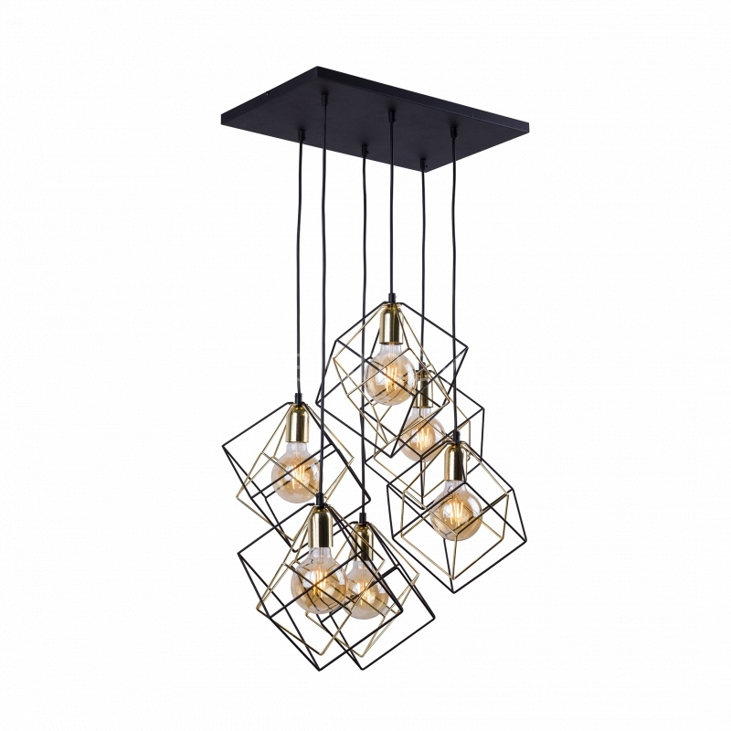 ALAMBRE 2779 to nowoczesna lampa wisząca z sześcioma źródłami światła. Stelaż lampy wykonano z metalu w kolorze czarnym. Lampa posiada sześć kloszy z drutu o geometrycznych kształtach w kolorze czarno-złotym zwisających z prostokątnej podsufitki. Kształt kloszy sprawia, że odsłonięte żarówki mogą być elementem ozdobnym lampy dlatego warto wybrać ich dekoracyjny model. Oprawa będzie idealnym wyborem do wnętrz urządzonych w stylu industrialnym oraz nowoczesnym. Doskonale wkomponuje się do każdego pomieszczenia. Dużą zaletą lampy jest możliwość regulacji wysokości. Wysokość maksymalna lampy to: 140 cm, szerokość 65 cm, głębokość 45 cm. Źródłem światła jest żarówka typu E27 o mocy max 60W w ilości 6 szt.