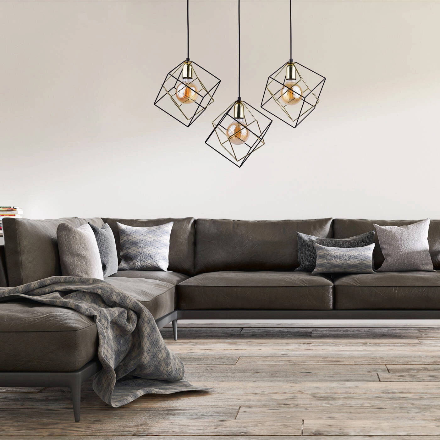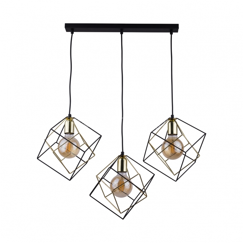 ALAMBRE 2699 to nowoczesna lampa wisząca z trzema źródłami światła. Stelaż lampy wykonano z metalu w kolorze czarnym. Lampa posiada trzy klosze z drutu o geometrycznych kształtach w kolorze czarno-złotym zwisające z podłużnej podsufitki. Kształt kloszy sprawia, że odsłonięte żarówki mogą być elementem ozdobnym lampy dlatego warto wybrać ich dekoracyjny model. Oprawa będzie idealnym wyborem do wnętrz urządzonych w stylu industrialnym oraz nowoczesnym. Doskonale wkomponuje się do każdego pomieszczenia. Dużą zaletą lampy jest możliwość regulacji wysokości. Wysokość maksymalna lampy to: 110 cm, szerokość 70 cm, głębokość 24 cm. Źródłem światła jest żarówka typu E27 o mocy max 60W w ilości 3 szt.