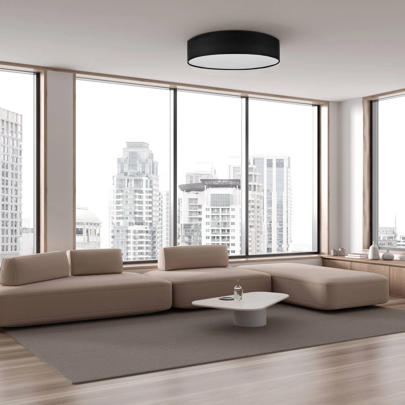 RONDO 1587 to nowoczesna lampa sufitowa z czterema źródłami światła. Lampa posiada cylindryczny abażur z tkaniny w czarnym kolorze od spodu zamknięty mleczną pleksi, która równomiernie rozprasza światło. Oprawa będzie idealnym wyborem do nowoczesnych wnętrz. Doskonale będzie się prezentować w: salonie, jadalni, sypialni, pokoju młodzieżowym, gabinecie, lokalu, przedpokoju. Lampa ma wysokość 13 cm i średnicę 61 cm. Źródłem światła jest żarówka E27 typu LED o mocy max 15W w ilości 4 szt.