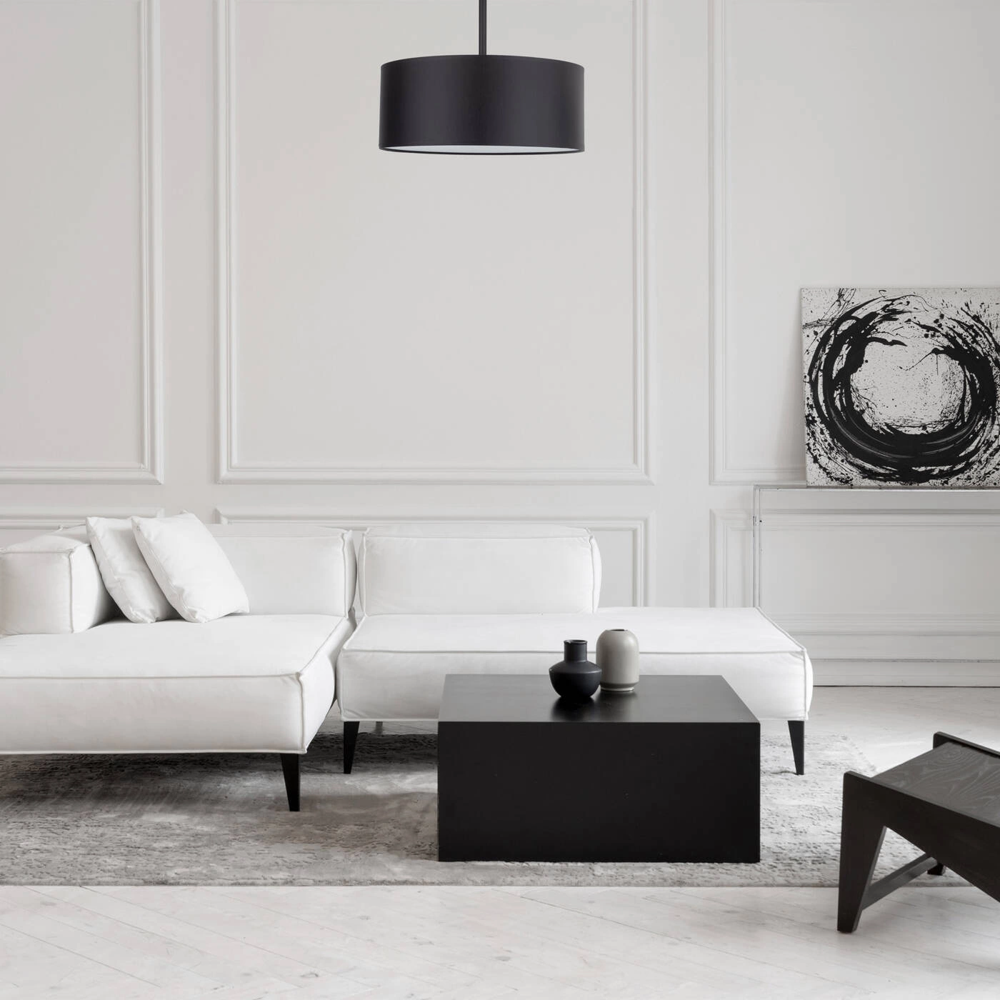 RONDO 4246 to nowoczesna lampa sufitowa z czterema źródłami światła. Lampa posiada cylindryczny abażur z tkaniny w czarnym kolorze od spodu zamknięty mleczną pleksi, która równomiernie rozprasza światło. Widoczna podsufitka jest w kolorze chromu. Oprawa będzie idealnym wyborem do nowoczesnych wnętrz. Doskonale będzie się prezentować w: salonie, jadalni, sypialni, pokoju młodzieżowym, gabinecie, lokalu. Wysokość lampy to: 38 cm, szerokość 40 cm, głębokość 40 cm. Klosz ma wysokość 17 cm i średnicę 40 cm. Źródłem światła jest żarówka E27 typu LED o mocy max 15W w ilości 4 szt.