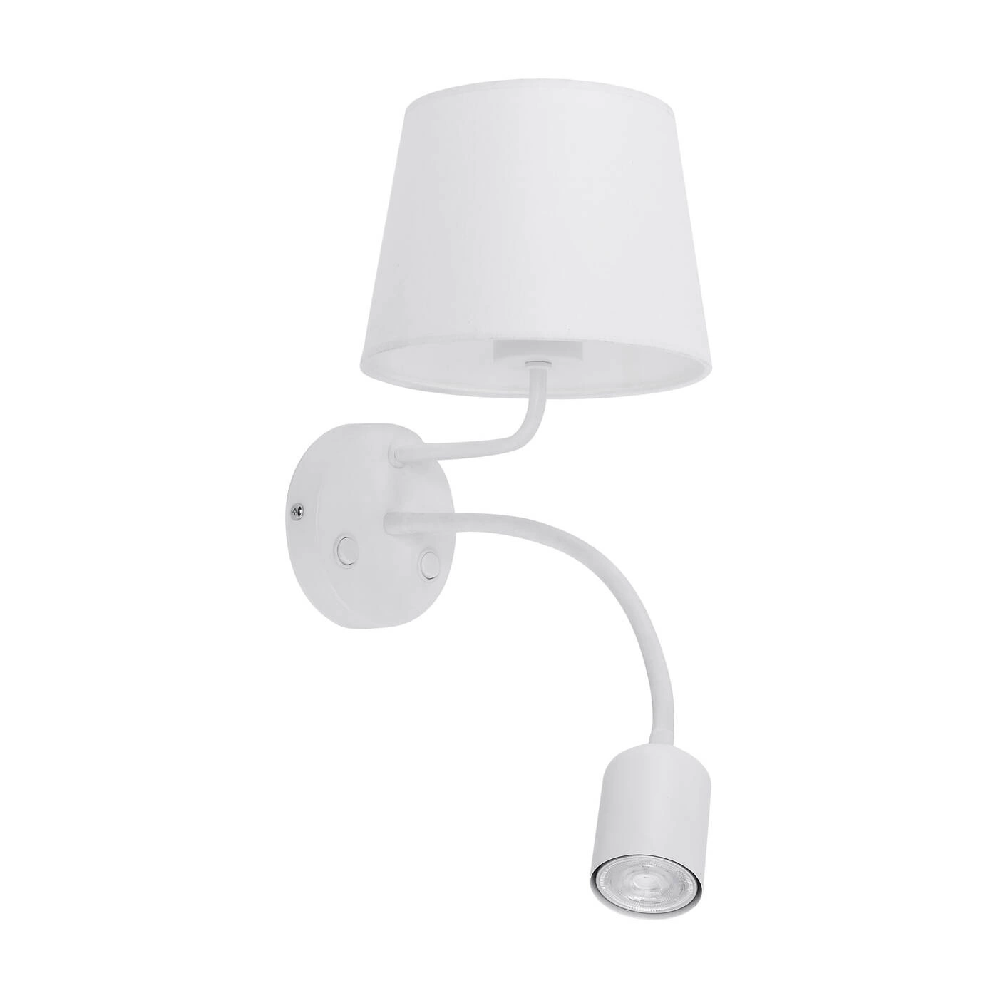 MAJA WHITE 2535 to nowoczesna lampa ścienna z dwoma źródłami światła. Stelaż lampy wykonano z metalu, abażur jest materiałowy. Całość wykończona jest w kolorze białym. Kinkiet posiada dodatkowe źródło światła osadzone na elastycznym ramieniu, dzięki czemu możemy skierować punkt padania światła w dowolnym kierunku (przydatne np. podczas czytania). Kinkiet będzie idealnym wyborem do nowoczesnych wnętrz. Doskonale będzie się prezentować w: salonie, jadalni, sypialni, pokoju młodzieżowym, gabinecie, lokalu. Wysokość kinkietu to: 45 cm, szerokość 20 cm, głębokość 30 cm. Źródłem światła jest żarówka E27 typu LED o mocy max 15W w ilości 1 szt. oraz GU10 LED o mocy 10W w ilości 1 szt.