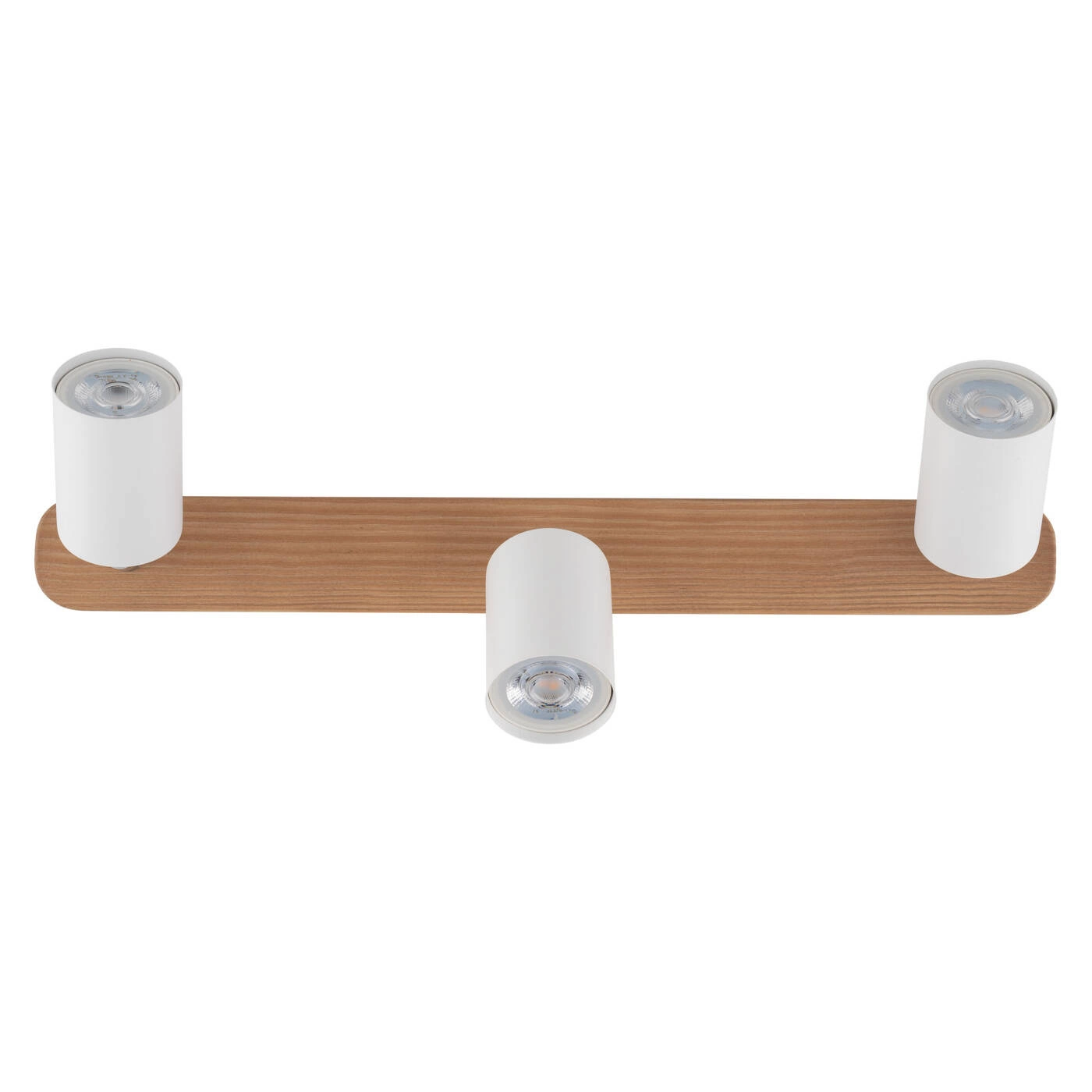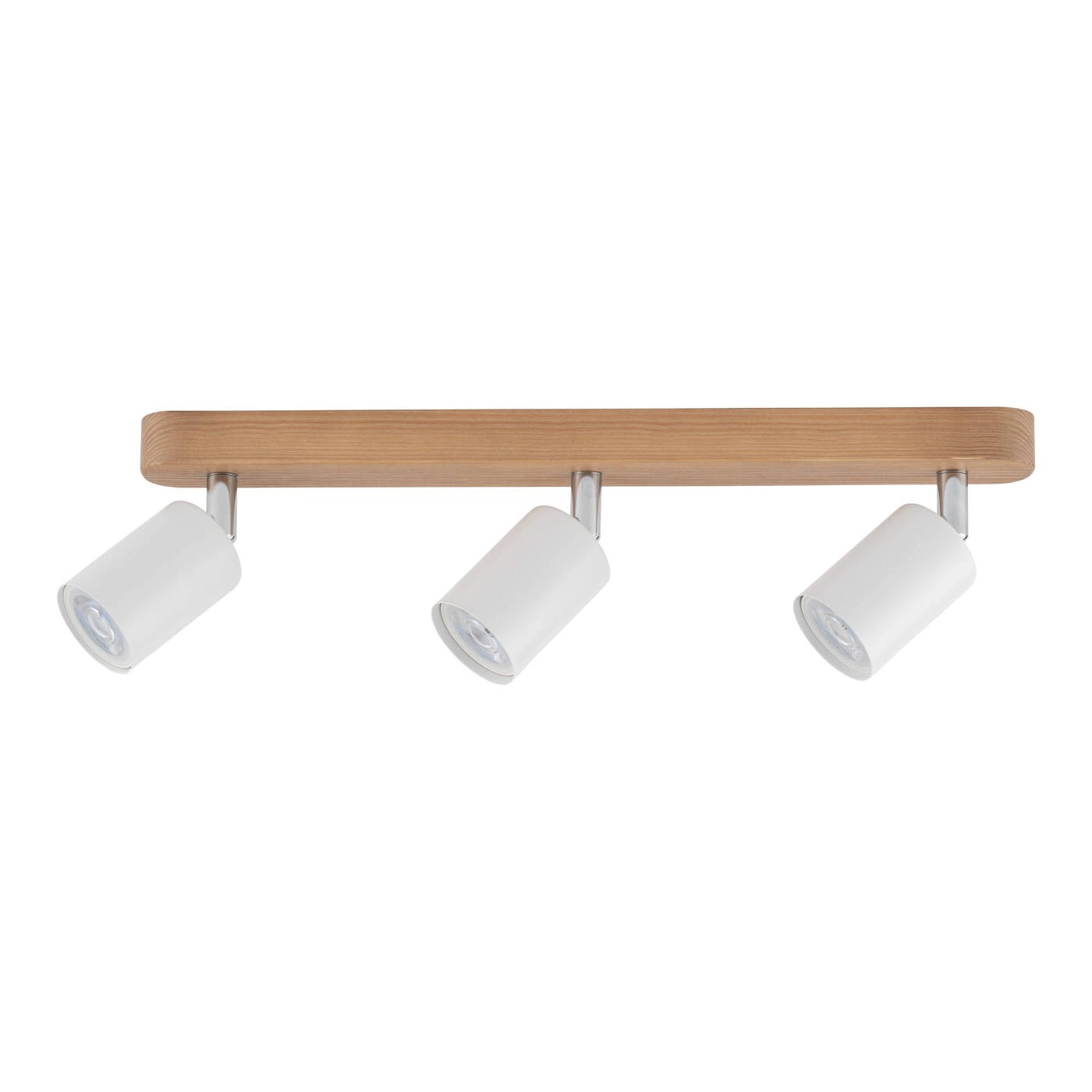 TOP WOOD 3296 to nowoczesna lampa sufitowa z trzema źródłami światła. Wykonana została z metalu w kolorze białym i drewna. Lampa składa się z podłużnej podsufitki z krótkimi ramionami, na których osadzono trzy reflektorki. Reflektorki mają możliwość regulacji punktu padania światła. Lampa będzie idealnym wyborem do nowoczesnych oraz industrialnych wnętrz. Doskonale będzie się prezentować w: salonie, jadalni, sypialni, pokoju młodzieżowym, gabinecie, biurze, przedpokoju. Wysokość lampy to: 14,5 cm, szerokość 50 cm, głębokość 17 cm. Źródłem światła jest żarówka GU10 typu LED o mocy max 10W w ilości 3 szt.