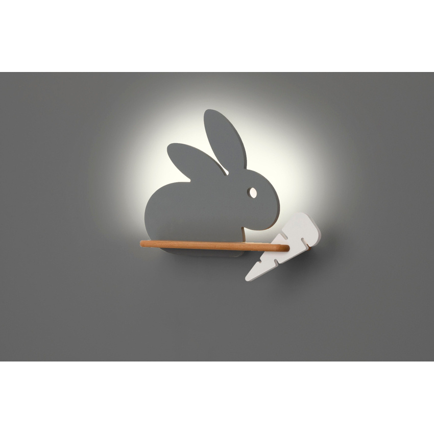 IQ KIDS RABBIT 21-84743 to nowoczesna lampa ścienna w kształcie królika ze zintegrowaną półeczką, przeznaczona do dziecięcego pokoju. Wykonana została z drewna w kolorze szarym. Wysokość lampki to: 31 cm, szerokość 37 cm, głębokość 12 cm. W lampie zastosowano źródło światła LED o mocy 5W, neutralnej barwie 4000K i jasności 250lm.