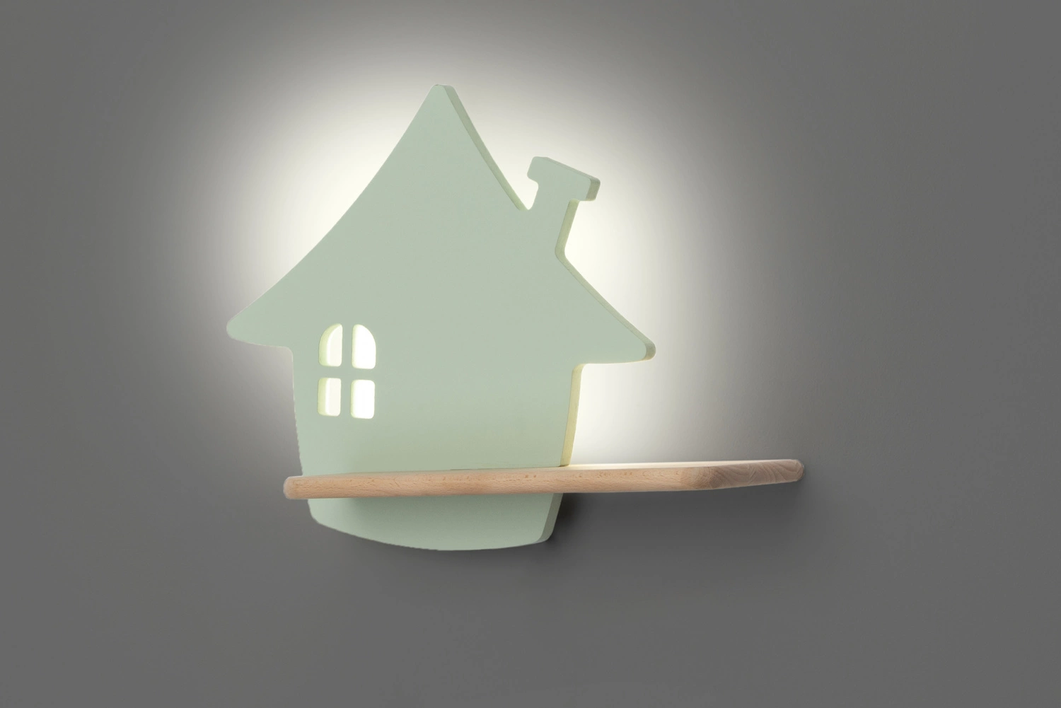 IQ KIDS HOUSE 21-84866 to nowoczesna lampa ścienna w kształcie domku ze zintegrowaną półeczką, przeznaczona do dziecięcego pokoju. Wykonana została z drewna w kolorze miętowym. Wysokość lampki to: 26 cm, szerokość 35 cm, głębokość 12 cm. W lampie zastosowano źródło światła LED o mocy 5W, neutralnej barwie 4000K i jasności 250lm.