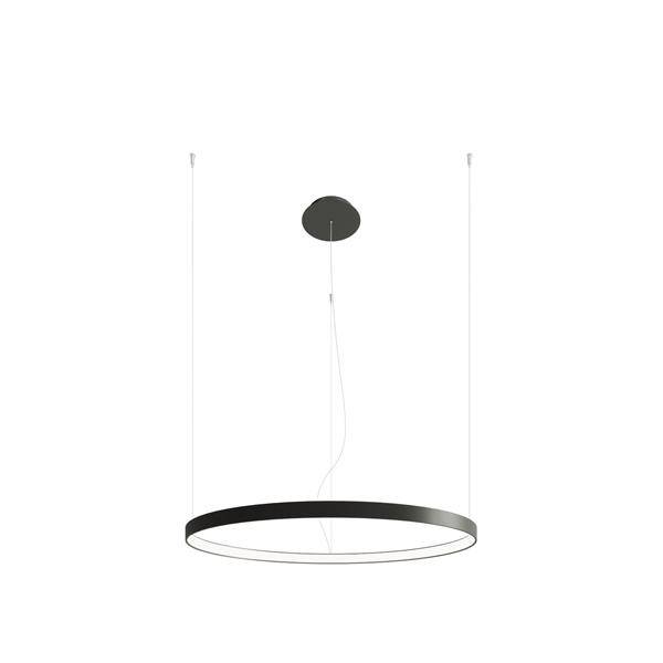 RIO TH.110 to nowoczesna lampa wisząca z jednym źródłem światła. Wykonana została z aluminium i tworzywa PVC. Lampa składa się z czarnego pierścienia zawieszonego na trzech stalowych linkach. Źródło światła znajduje się pod białym matowym dyfuzorem, który doskonale rozprasza światło. Lampa będzie idealnym wyborem do nowoczesnych wnętrz. Świetnie będzie się prezentować w: salonie, jadalni, sypialni, pokoju młodzieżowym, gabinecie, lokalu, korytarzu, przedpokoju, kuchni. Dużą zaletą jest możliwość regulacji wysokości. Wysokość maksymalna lampy to: 150 cm, szerokość 78 cm, głębokość 78 cm. Źródłem światła jest wbudowany moduł LED o mocy 50W, neutralnej barwie światła 4000K i jasności 5520 lm.
