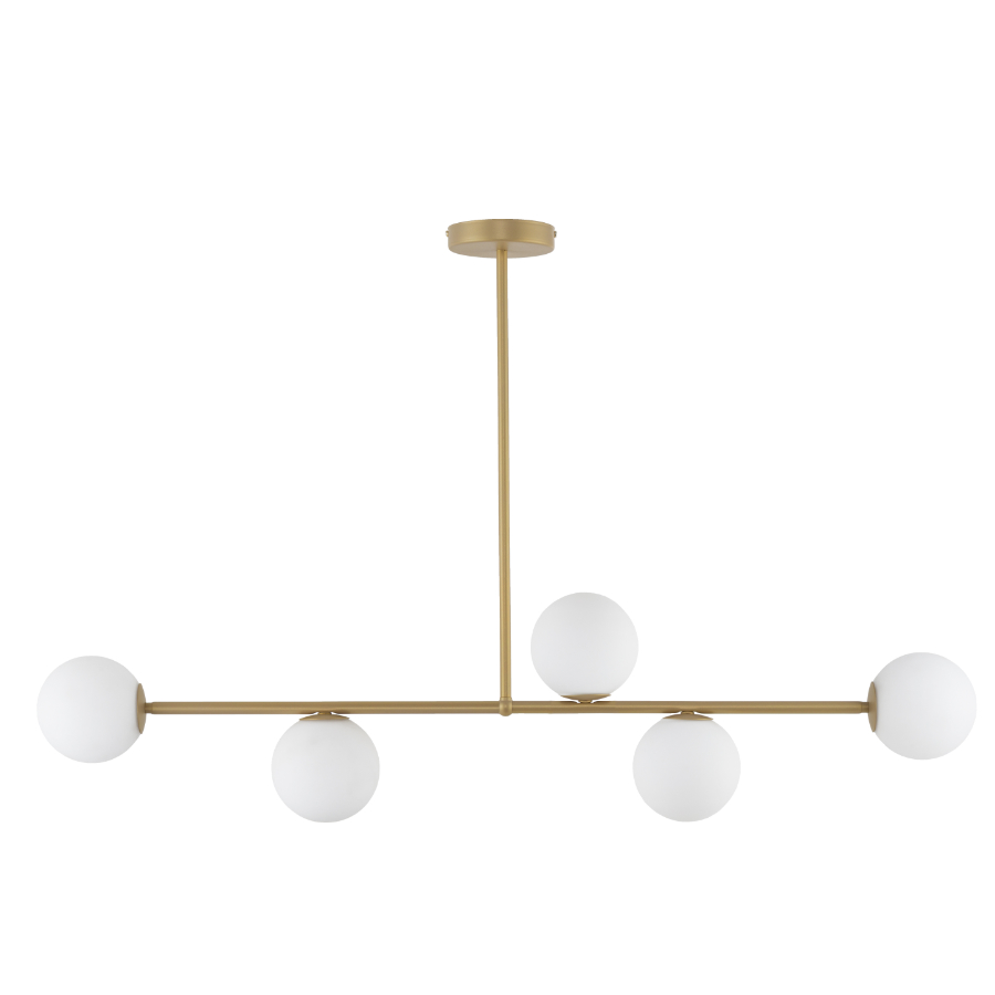 Stelaż lampy wykonany jest ze stali lakierowanej proszkowo w kolorze złotym. Lampa posiada dwa białe szklane klosze w kształcie kul osadzone na poziomym ramieniu.