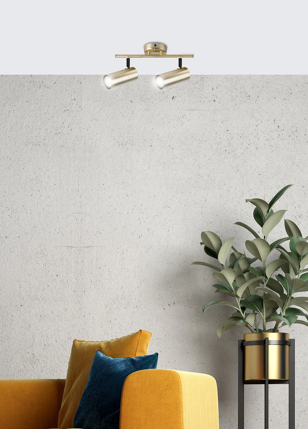 COLLY 92-01719 to stylowa lampa z dwoma źródłami światła, która może być zamontowana zarówno na ścianie jak i na suficie. Wykonana została z wysokiej jakości metalu w kolorze mosiądzu. Klosze lampy osadzone są na ruchomych przegubach dzięki czemu można regulować kierunek padania światła. Oprawa będzie idealnym wyborem do wnętrz urządzonych w stylu klasycznym oraz nowoczesnym. Doskonale będzie się prezentować w: salonie, jadalni, sypialni, pokoju młodzieżowym, gabinecie, lokalu, kuchni, przedpokoju. Wysokość lampy to: 18 cm, szerokość 34 cm, głębokość 9 cm. Źródłem światła jest żarówka typu GU10 o mocy max 15W w ilości 2 szt.