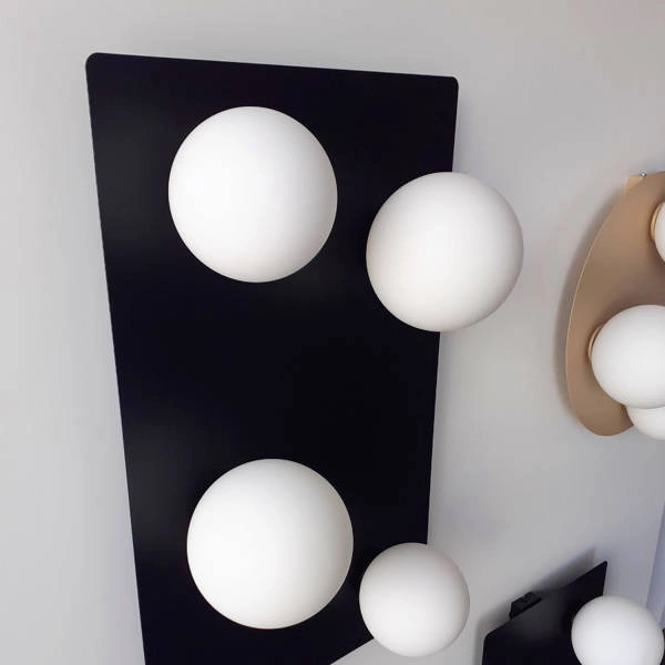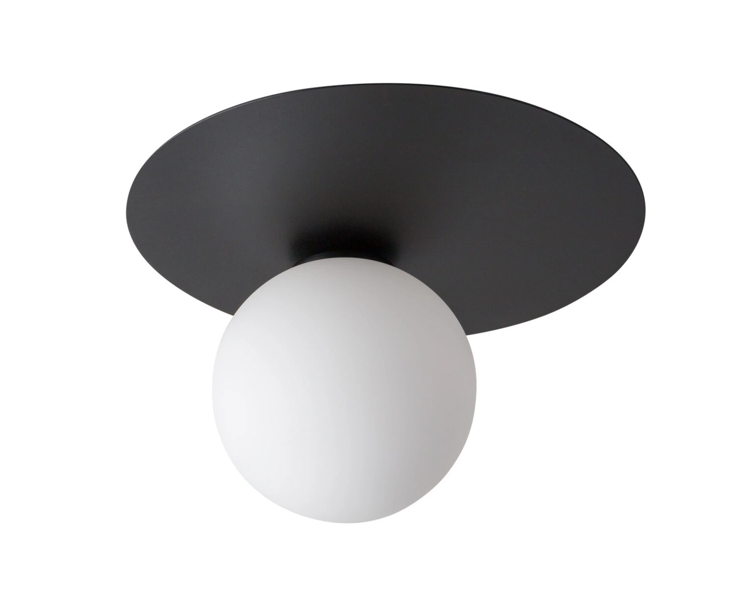 Wykonana z lakierowanej stalowej podstawy i szklanego klosza w formie kuli.