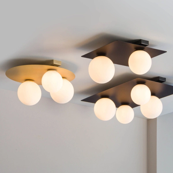 • Minimalistyczny plafon z kloszami w kształcie kul montowane na smukłej podsufitce.