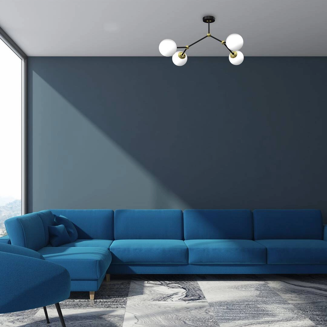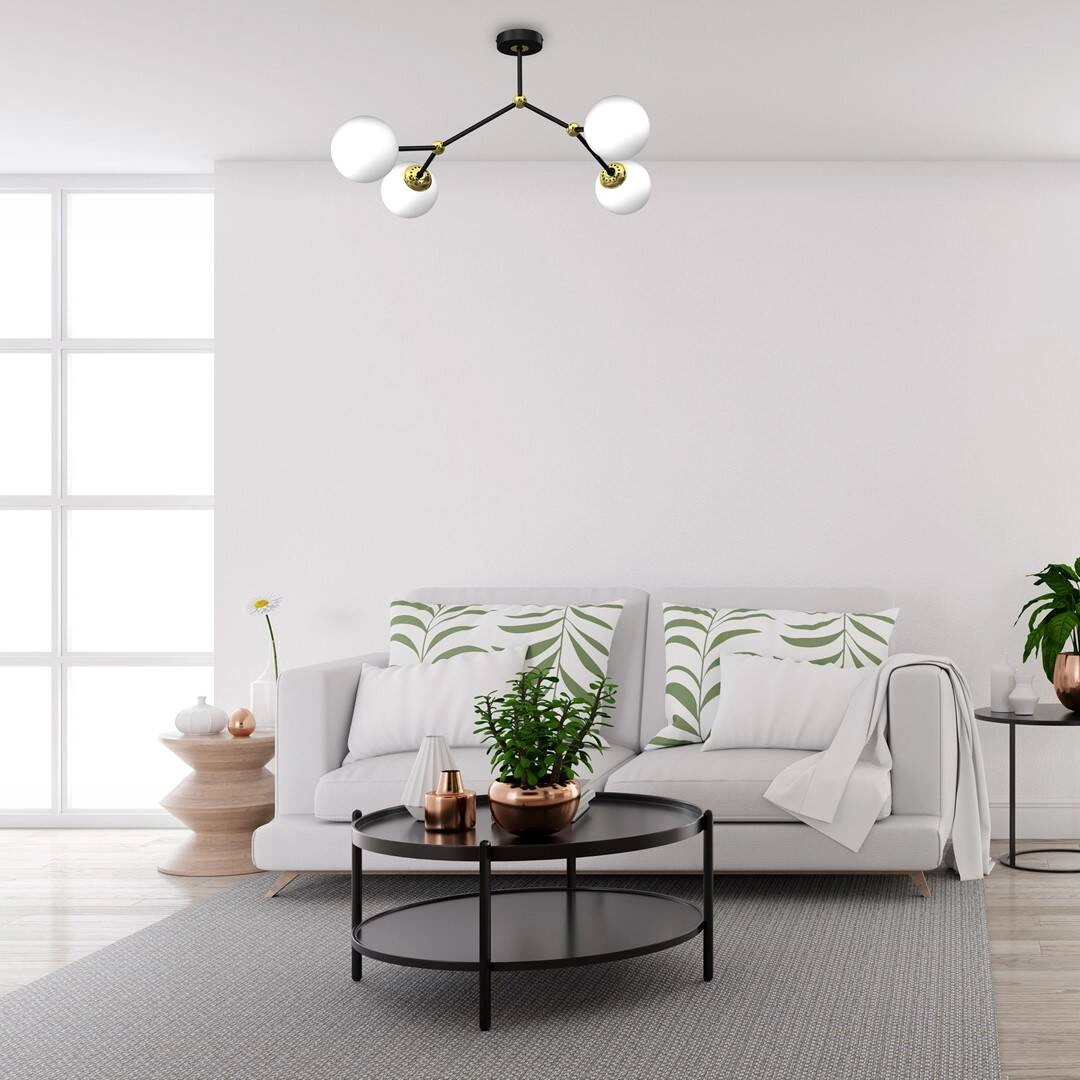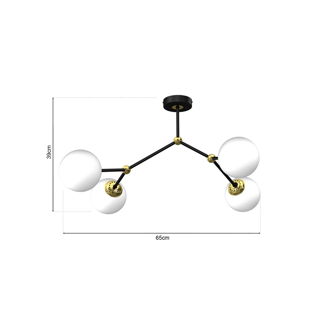 JOY MLP7461 to stylowa lampa sufitowa z czterema źródłami światła. Lampa składa się z metalowego stelaża w kolorze czarnym ze złotymi wstawkami i kulistych kloszy z białego szkła. Oprawa będzie idealnym wyborem do wnętrz urządzonych w stylu klasycznym, nowoczesnym oraz glamour. Doskonale będzie się prezentować w: salonie, jadalni, sypialni, pokoju młodzieżowym, gabinecie, lokalu, przedpokoju, kuchni. Wysokość lampy to: 39 cm, szerokość 65 cm, głębokość 60 cm. Źródłem światła jest żarówka typu E14 o mocy max 40W w ilości 4 szt.