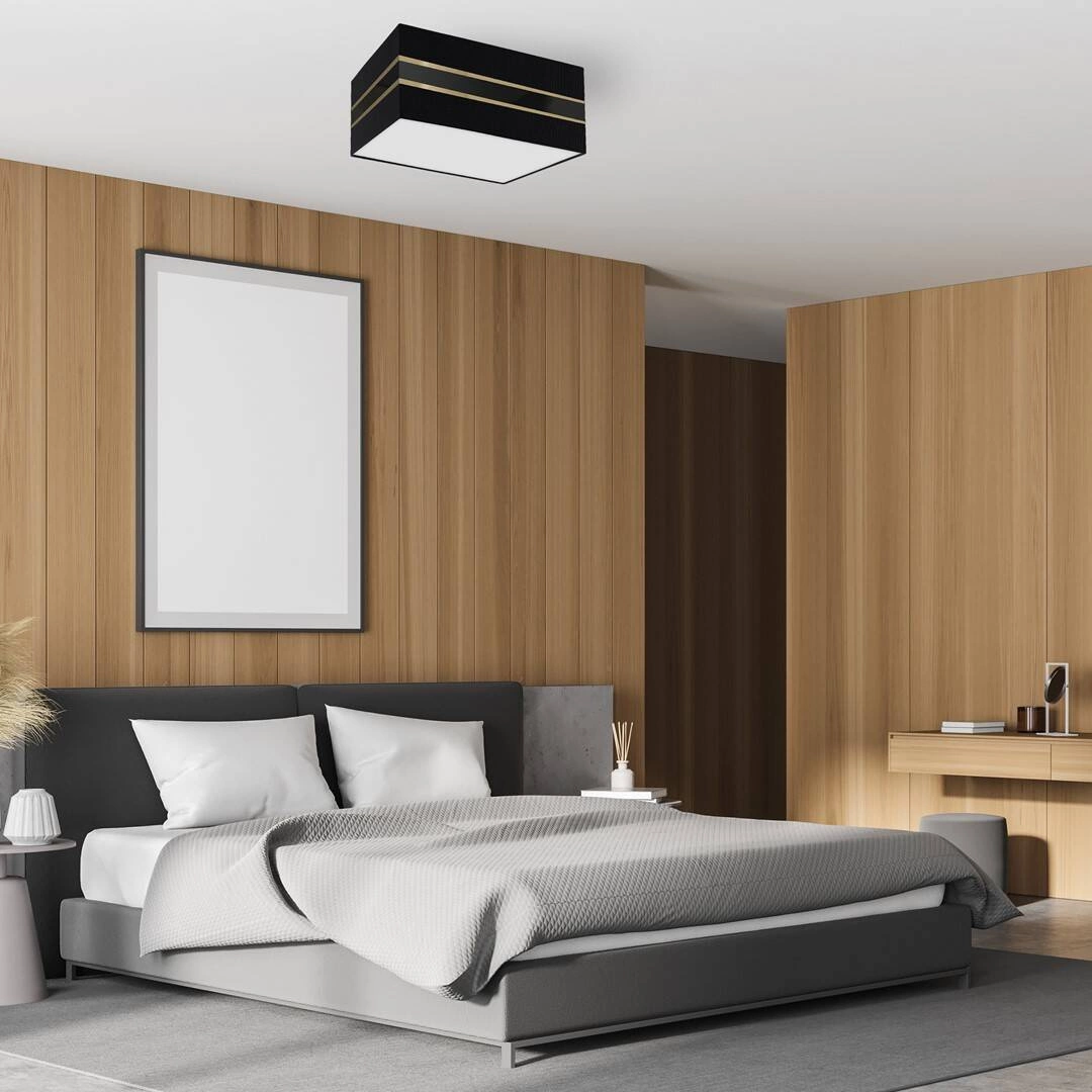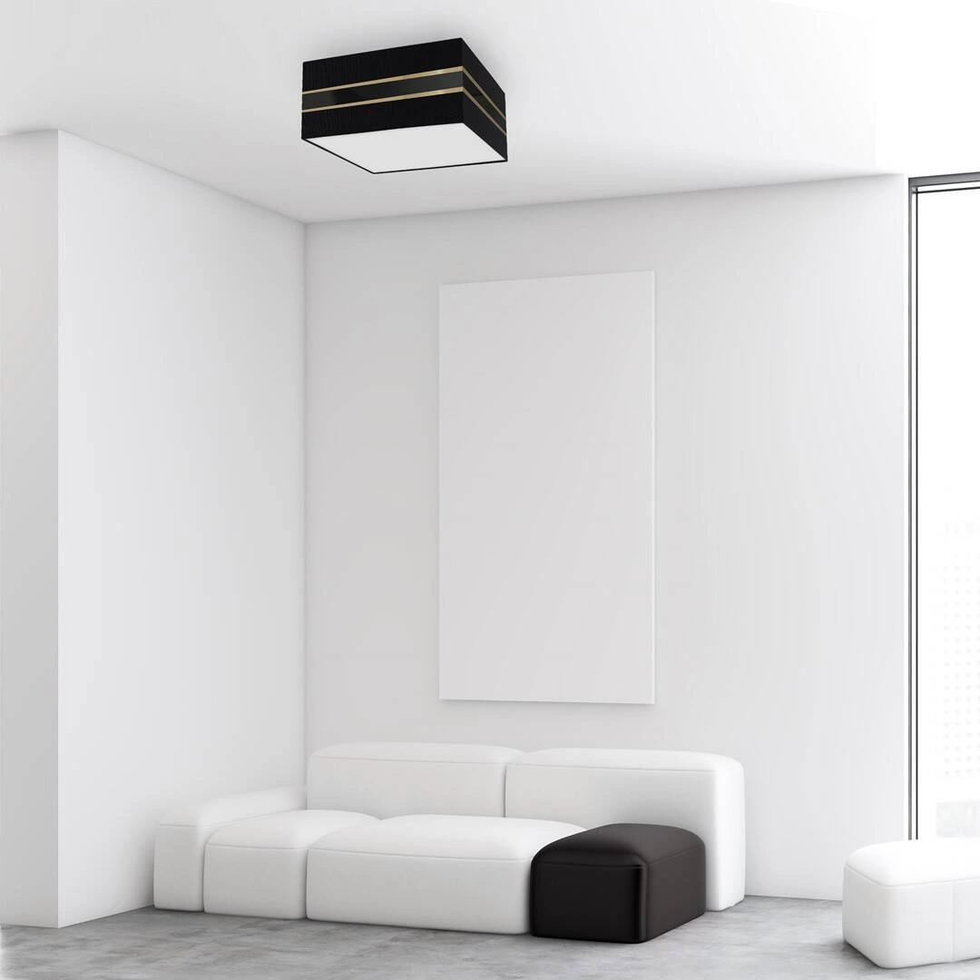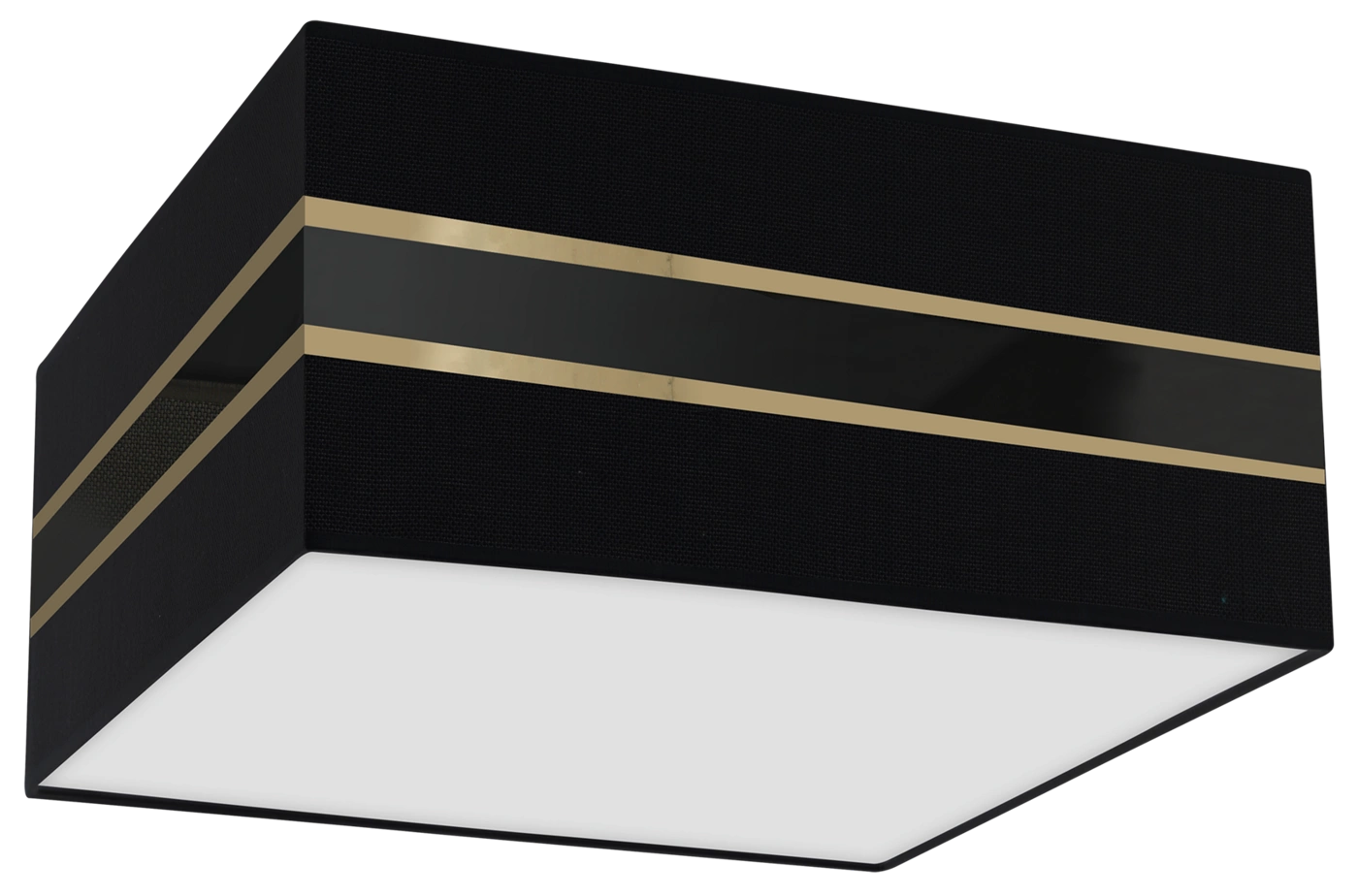 ULTIMO BLACK MLP7336 to stylowa lampa sufitowa z dwoma źródłami światła. Korpus lampy wykonano z wysokiej jakości metalu. Lampa posiada kwadratowy klosz z czarnej tkaniny z ozdobnymi złotymi akcentami i transparentnym pasem na środku. Oprawa będzie idealnym wyborem do wnętrz urządzonych w stylu klasycznym, nowoczesnym oraz glamour. Doskonale będzie się prezentować w: salonie, jadalni, sypialni, pokoju młodzieżowym, gabinecie, lokalu, biurze, przedpokoju, kuchni. Wysokość lampy to: 13 cm, szerokość 40 cm, głębokość 40 cm. Źródłem światła jest żarówka typu E27 o mocy max 60W w ilości 2 szt.