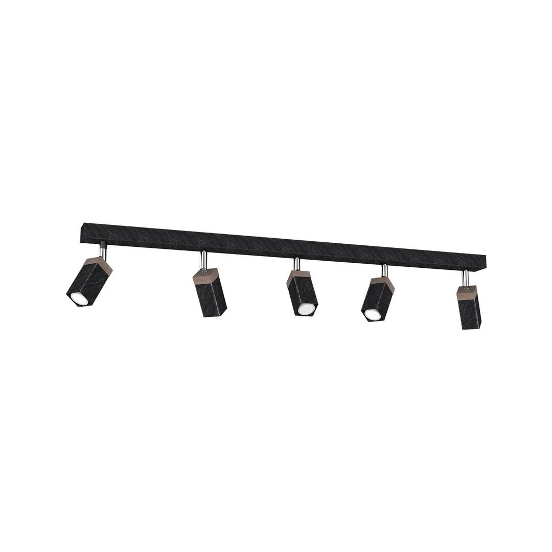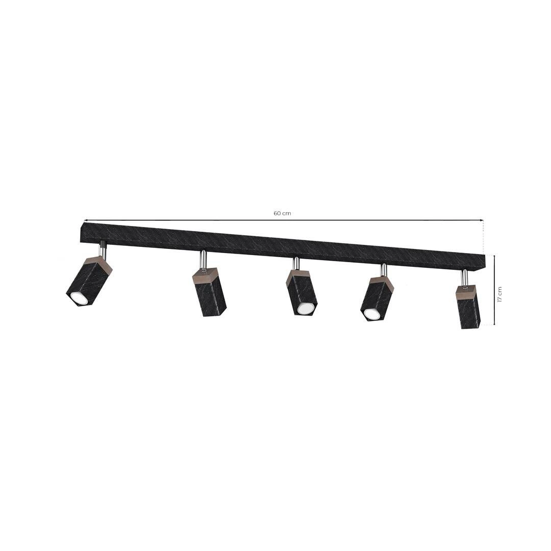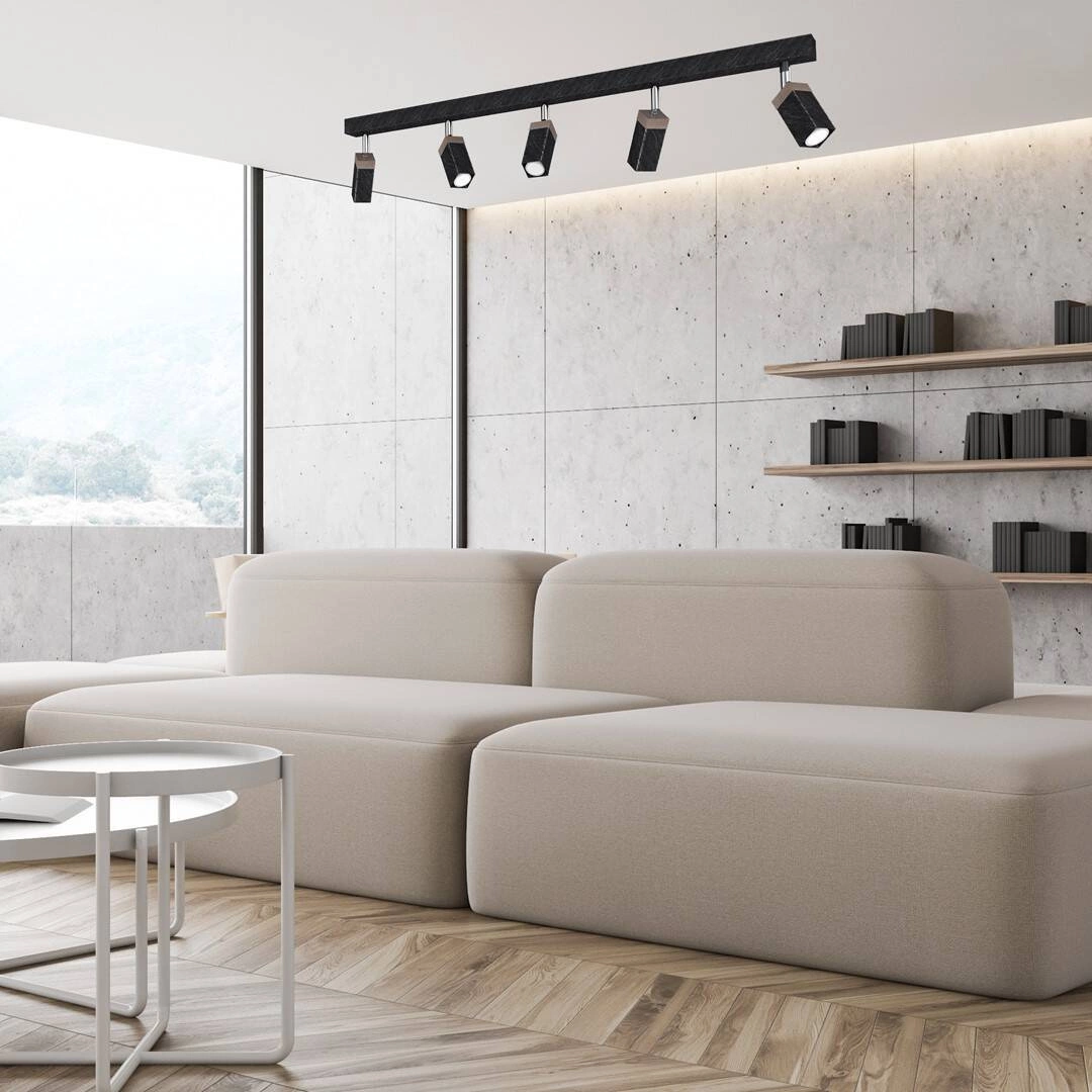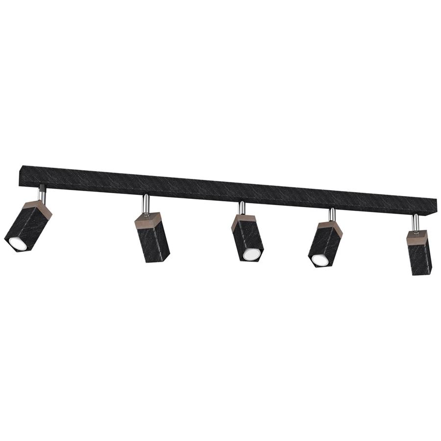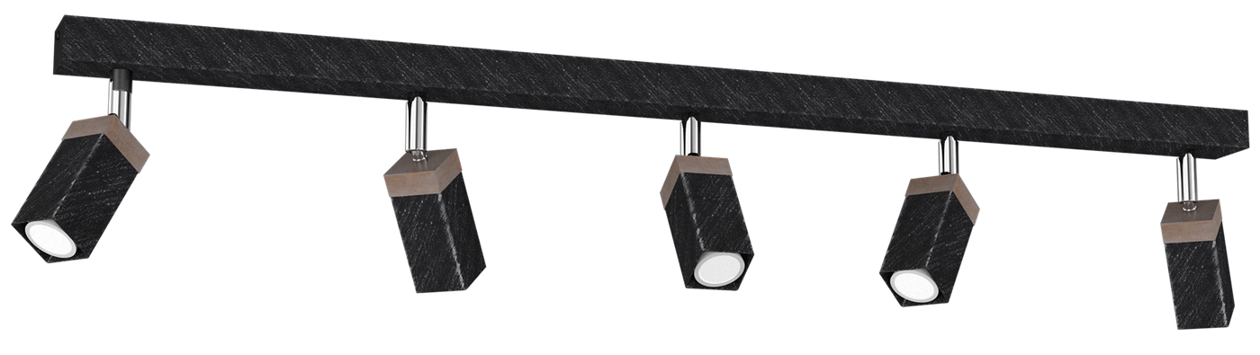 SOLO MLP7474 to stylowa lampa sufitowa z pięcioma źródłami światła. Wykonana została z wysokiej jakości metalu w kolorze czarnym przecieranym z wstawkami z patynowanego drewna. Klosze lampy mają możliwość regulacji kąta padania światła. Oprawa będzie idealnym wyborem do wnętrz urządzonych w stylu nowoczesnym oraz skandynawskim. Doskonale będzie się prezentować w: salonie, jadalni, sypialni, pokoju młodzieżowym, gabinecie, biurze, lokalu, przedpokoju, kuchni. Wysokość lampy to: 17 cm, szerokość 60 cm, głębokość 4 cm. Źródłem światła jest żarówka typu mini GU10 o mocy max 5W w ilości 5 szt.