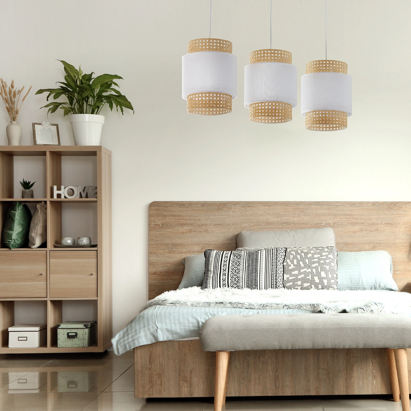 Trzy klosze przyozdobione rattanowym wykończeniem będzie stanowił idealną dekorację w każdej kuchni bądź salonie.
