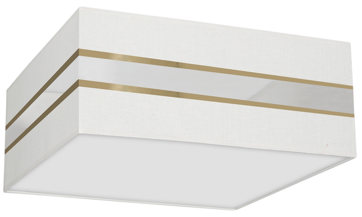 ULTIMO WHITE MLP7348 to stylowa lampa sufitowa z trzema źródłami światła. Korpus lampy wykonano z wysokiej jakości metalu. Lampa posiada kwadratowy klosz z białej tkaniny z ozdobnymi złotymi akcentami i transparentnym pasem na środku. Oprawa będzie idealnym wyborem do wnętrz urządzonych w stylu klasycznym, nowoczesnym oraz glamour. Doskonale będzie się prezentować w: salonie, jadalni, sypialni, pokoju młodzieżowym, gabinecie, lokalu, biurze, przedpokoju, kuchni. Wysokość lampy to: 13 cm, szerokość 50 cm, głębokość 50 cm. Źródłem światła jest żarówka typu E27 o mocy max 60W w ilości 3 szt.