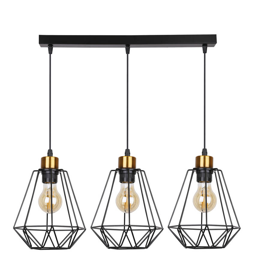 PRIMO 33-00231 to stylowa lampa wisząca z trzema źródłami światła. Zawiesie lampy wykonano z wysokiej jakości stali w kolorze czarnym ze złotymi detalami, klosze są druciane. Kształt kloszy sprawia że odsłonięte żarówki są elementami ozdobnymi dlatego warto wybrać ich dekoracyjny model. Oprawa będzie idealnym wyborem do wnętrz urządzonych w stylu nowoczesnym, industrialnym oraz loftowym. Doskonale będzie się prezentować w: salonie, jadalni, sypialni, pokoju młodzieżowym, gabinecie, lokalu, kuchni. Dużym atutem jest możliwość regulacji wysokości. Wysokość maksymalna lampy to: 100 cm, szerokość 69 cm, głębokość 19 cm. Źródłem światła jest żarówka typu E27 o mocy max 60W w ilości 3 szt.