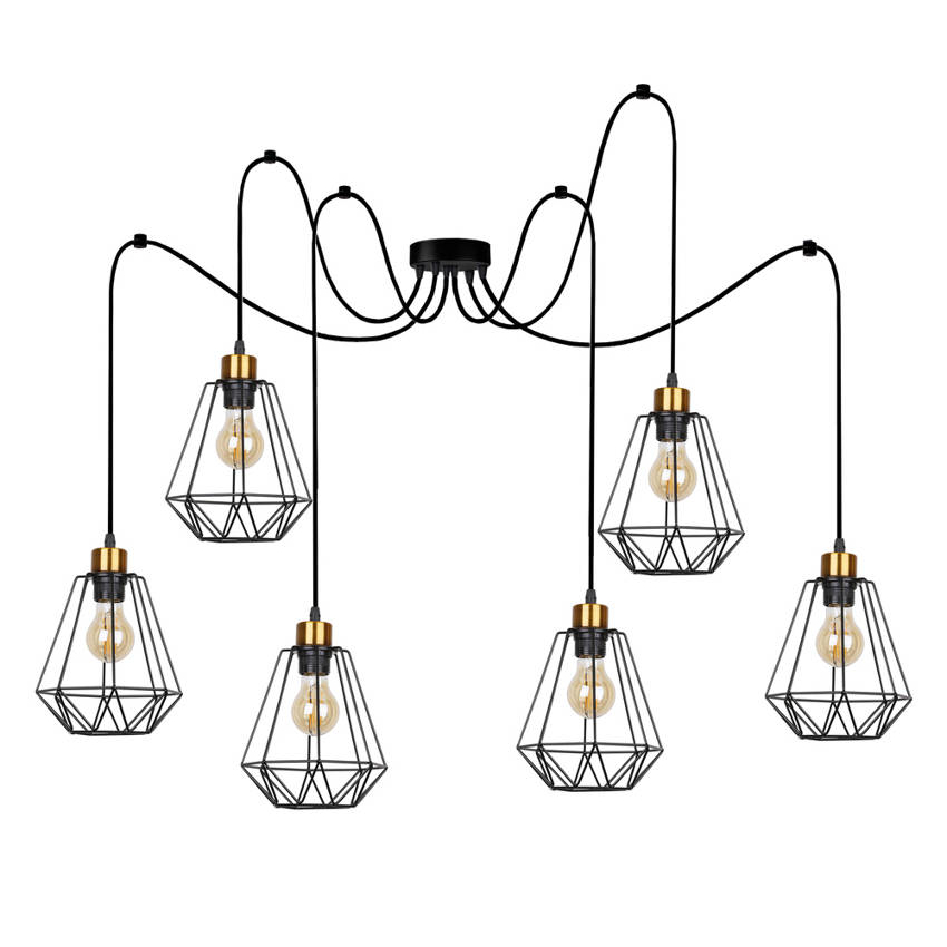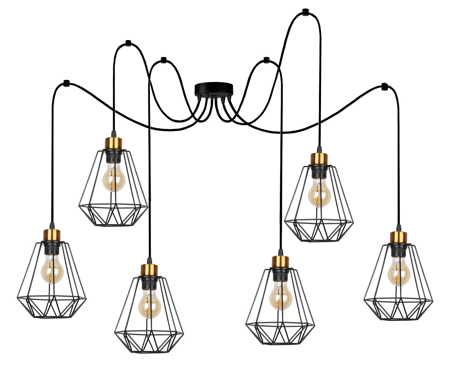 PRIMO 36-00316 to stylowa lampa wisząca z sześcioma źródłami światła. Zawiesie lampy wykonano z wysokiej jakości stali w kolorze czarnym ze złotymi detalami, klosze są druciane. Kształt kloszy sprawia że odsłonięte żarówki są elementami ozdobnymi dlatego warto wybrać ich dekoracyjny model. Oprawa będzie idealnym wyborem do wnętrz urządzonych w stylu nowoczesnym, industrialnym oraz loftowym. Doskonale będzie się prezentować w: salonie, jadalni, sypialni, pokoju młodzieżowym, gabinecie, lokalu, kuchni. Dużym atutem jest możliwość regulacji wysokości. Wysokość maksymalna lampy to: 200 cm, szerokość 19 cm, głębokość 19 cm. Źródłem światła jest żarówka typu E27 o mocy max 60W w ilości 6 szt.