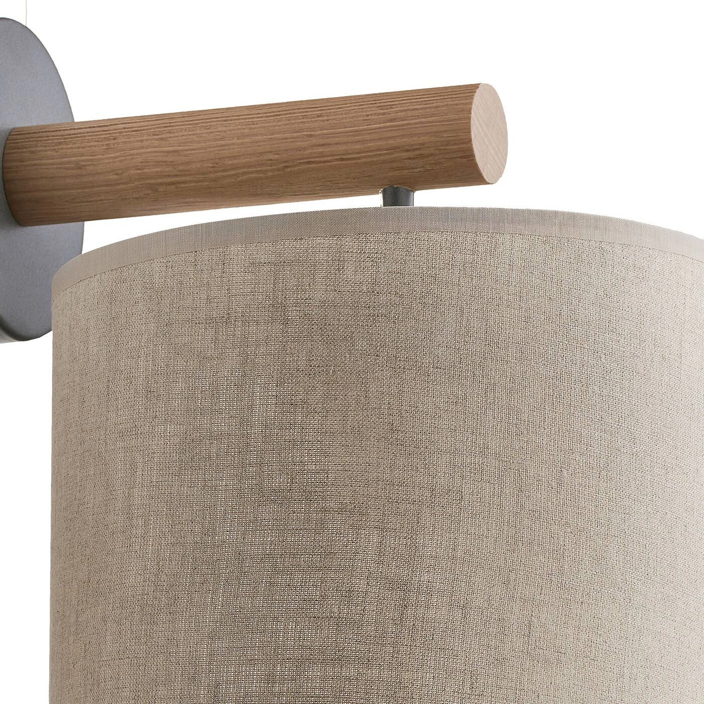 Abażur ma kształt walca i jest wykonany z lnu w kolorze szaro beżowym.