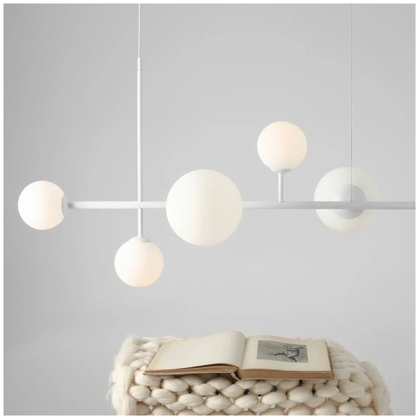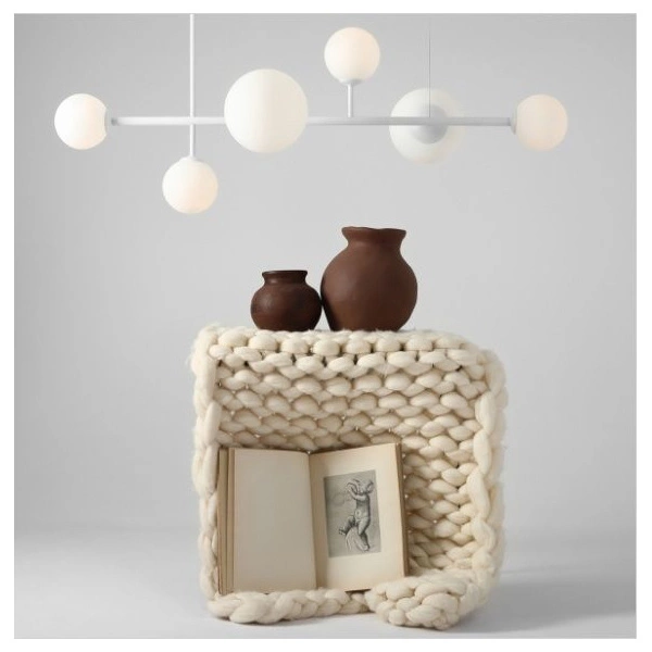 DIONE 1092K to nowoczesna lampa wisząca z sześcioma źródłami światła. Korpus lampy wykonano z wysokiej jakości metalu w kolorze białym. Klosze są wykonane z białego szkła. Lampa mocowana jest do sufitu z jednej strony na puszce z przewodem, z drugiej na stalowej lince. Oprawa będzie idealnym wyborem do wnętrz urządzonych w nowoczesnym stylu. Doskonale będzie się prezentować w: salonie, jadalni, sypialni, pokoju młodzieżowym, lokalu, kuchni. Dużą zaletą jest możliwość regulacji wysokości. Wysokość maksymalna lampy to: 110 cm, szerokość 130 cm, głębokość 62 cm. Do lampy niezbędne są żarówki: 4 szt. E14 o mocy max 40W oraz 2 szt. E27 o mocy max 60W