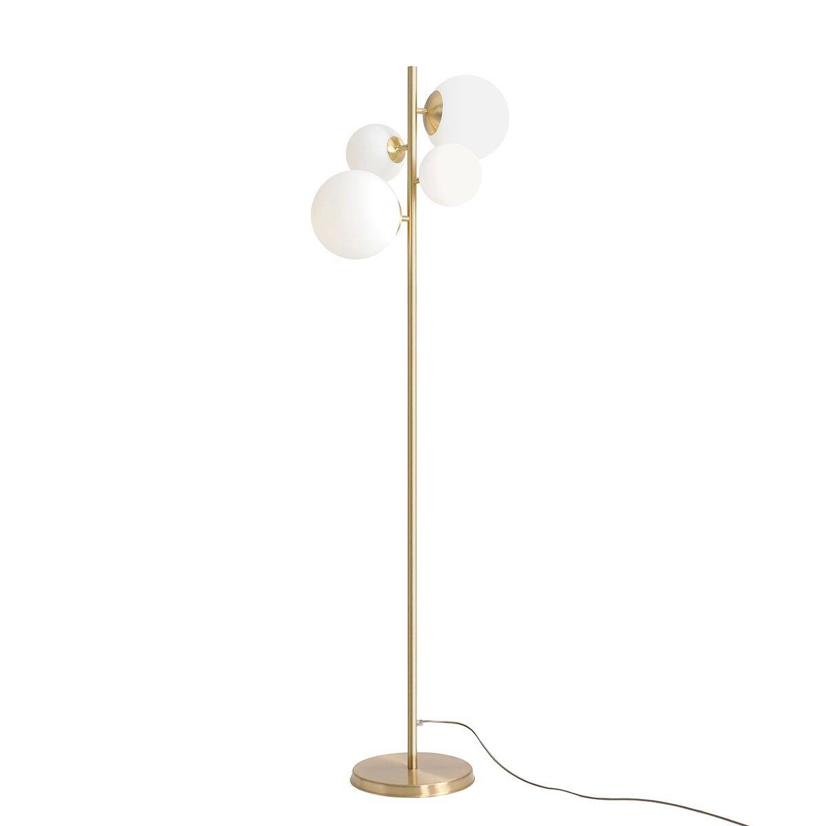 BLOOM 1091A40 to nowoczesna lampa podłogowa z czterema źródłami światła. Podstawę lampy wykonano z wysokiej jakości metalu w kolorze szczotkowanego mosiądzu. Lampa posiada cztery szklane, białe klosze w dwóch rozmiarach: fi 14 cm i fi 20 cm. Oprawa będzie idealnym wyborem do wnętrz urządzonych w stylu nowoczesnym oraz minimalistycznym. Doskonale będzie się prezentować w: salonie, jadalni, sypialni, pokoju młodzieżowym, lokalu, przedpokoju. Wysokość lampy to: 161 cm, szerokość 48 cm, głębokość 35 cm. Do lampy niezbędne są żarówki: 2 szt. E14 o mocy max 40W oraz 2 szt. E27 o mocy max 60W