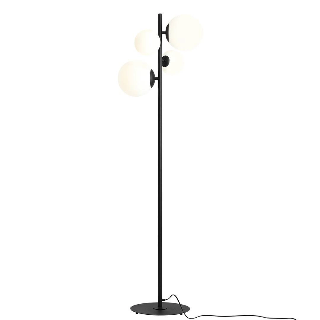 BLOOM 1091A1 to nowoczesna lampa podłogowa z czterema źródłami światła. Podstawę lampy wykonano z wysokiej jakości metalu w kolorze czarnym. Lampa posiada cztery szklane, białe klosze w dwóch rozmiarach: fi 14 cm i fi 20 cm. Oprawa będzie idealnym wyborem do wnętrz urządzonych w stylu nowoczesnym oraz minimalistycznym. Doskonale będzie się prezentować w: salonie, jadalni, sypialni, pokoju młodzieżowym, lokalu, przedpokoju. Wysokość lampy to: 161 cm, szerokość 48 cm, głębokość 35 cm. Do lampy niezbędne są żarówki: 2 szt. E14 o mocy max 40W oraz 2 szt. E27 o mocy max 60W
