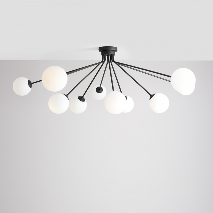 HOLM 10 BLACK CEILING 1082PL_M1 to designerska lampa sufitowa z dziesięcioma źródłami światła. Korpus lampy składa się z czarnych metalowych ramion o różnych długościach i nachyleniu zakończonych białymi szklanymi kloszami. Ramiona lampy są ruchome co sprawia, że można samodzielnie zmieniać ich położenie. Oprawa będzie idealnym wyborem do wnętrz urządzonych w nowoczesnym stylu. Doskonale będzie się prezentować w: salonie, jadalni, sypialni, pokoju młodzieżowym, lokalu. Wysokość lampy to: 48 cm, szerokość 140 cm, głębokość 140 cm. Źródłem światła jest żarówka typu E14 o mocy max 40W w ilości 10 szt.