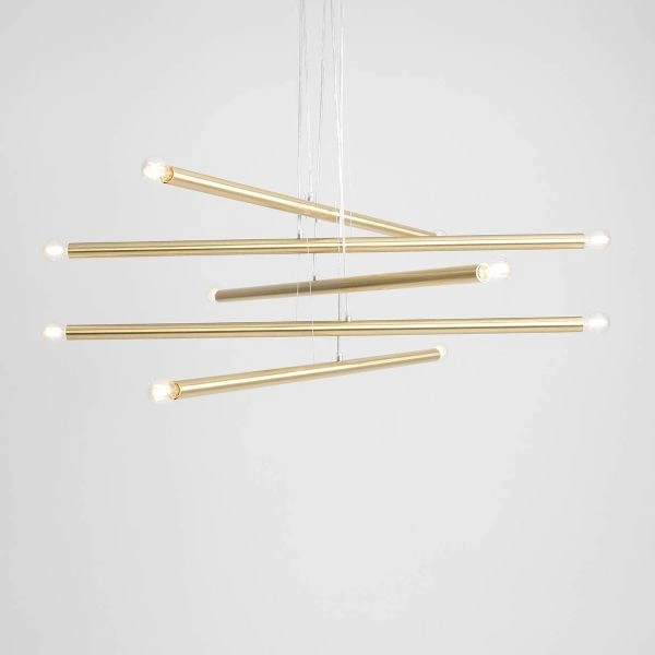 TUBO 10 to nowoczesna lampa wisząca z dziesięcioma źródłami światła, która składa się z pięciu luźno zawieszonych metalowych tub w kolorze mosiądzu zakończonych oprawkami żarówek. Lampa nie posiada kloszy co sprawia, że odsłonięte żarówki mogą być elementami ozdobnymi dlatego warto wybrać ich dekoracyjny model. Oprawa będzie idealnym wyborem do wnętrz urządzonych w stylu nowoczesnym, minimalistycznym oraz loftowym. Doskonale będzie się prezentować w: salonie, jadalni, sypialni, pokoju młodzieżowym, gabinecie, lokalu, kuchni. Dużą zaletą jest możliwość regulacji wysokości oraz pochylenia tub. Wysokość maksymalna lampy to: 105 cm, szerokość 100 cm, głębokość 100 cm. Źródłem światła jest żarówka typu E14 o mocy max 40W w ilości 10 szt.