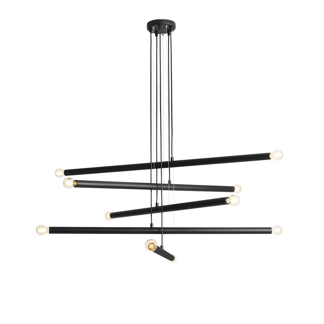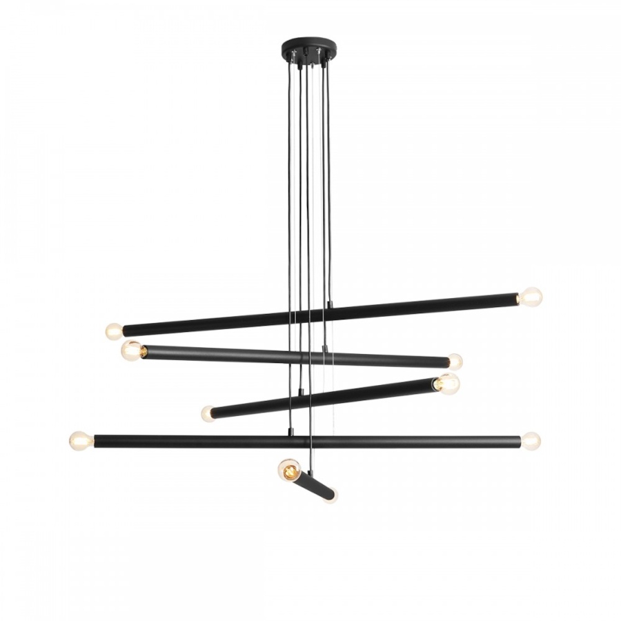 TUBO 10 to nowoczesna lampa wisząca z dziesięcioma źródłami światła, która składa się z pięciu luźno zawieszonych metalowych tub w kolorze czarnym zakończonych oprawkami żarówek. Lampa nie posiada kloszy co sprawia, że odsłonięte żarówki mogą być elementami ozdobnymi dlatego warto wybrać ich dekoracyjny model. Oprawa będzie idealnym wyborem do wnętrz urządzonych w stylu nowoczesnym, minimalistycznym oraz loftowym. Doskonale będzie się prezentować w: salonie, jadalni, sypialni, pokoju młodzieżowym, gabinecie, lokalu, kuchni. Dużą zaletą jest możliwość regulacji wysokości oraz pochylenia tub. Wysokość maksymalna lampy to: 105 cm, szerokość 100 cm, głębokość 100 cm. Źródłem światła jest żarówka typu E14 o mocy max 40W w ilości 10 szt.