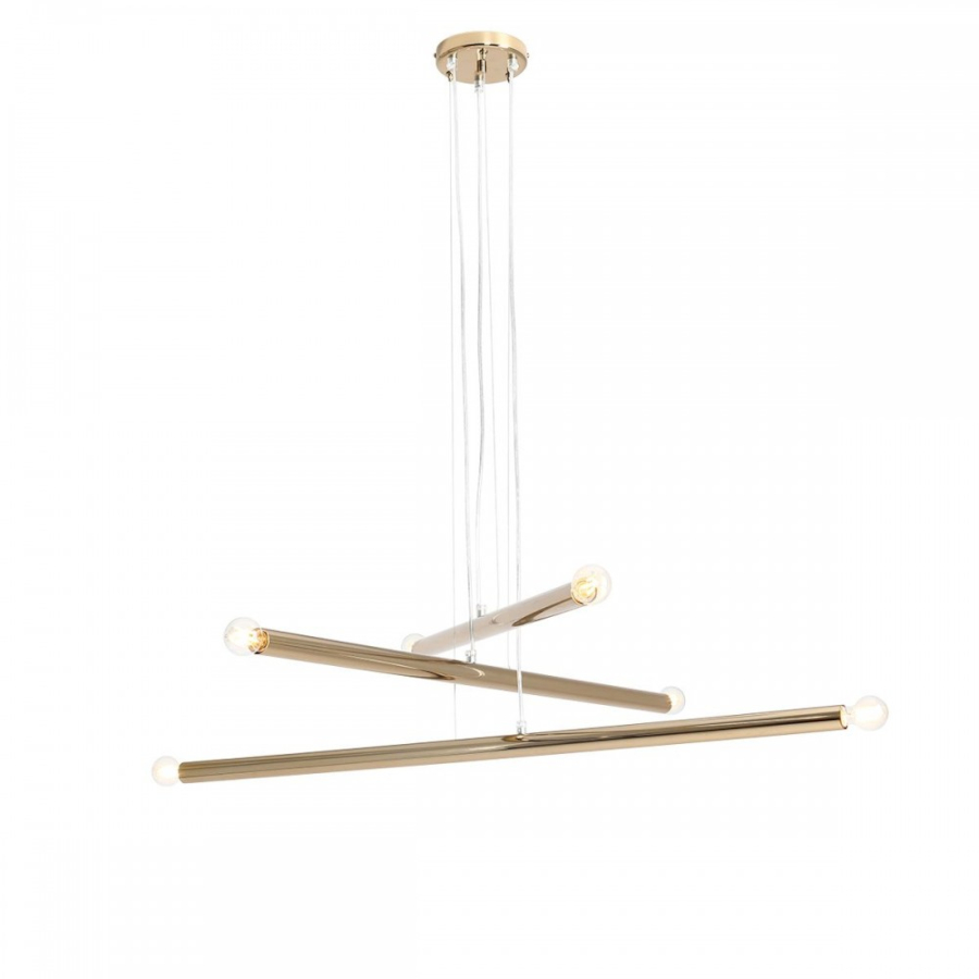 TUBO 6 to nowoczesna lampa wisząca z sześcioma źródłami światła, która składa się z trzech luźno zawieszonych metalowych tub w kolorze złotym zakończonych oprawkami żarówek. Lampa nie posiada kloszy co sprawia, że odsłonięte żarówki mogą być elementami ozdobnymi dlatego warto wybrać ich dekoracyjny model. Oprawa będzie idealnym wyborem do wnętrz urządzonych w stylu nowoczesnym, minimalistycznym oraz loftowym. Doskonale będzie się prezentować w: salonie, jadalni, sypialni, pokoju młodzieżowym, gabinecie, lokalu, kuchni. Dużą zaletą jest możliwość regulacji wysokości oraz pochylenia tub. Wysokość maksymalna lampy to: 105 cm, szerokość 100 cm, głębokość 100 cm. Źródłem światła jest żarówka typu E14 o mocy max 40W w ilości 6 szt.